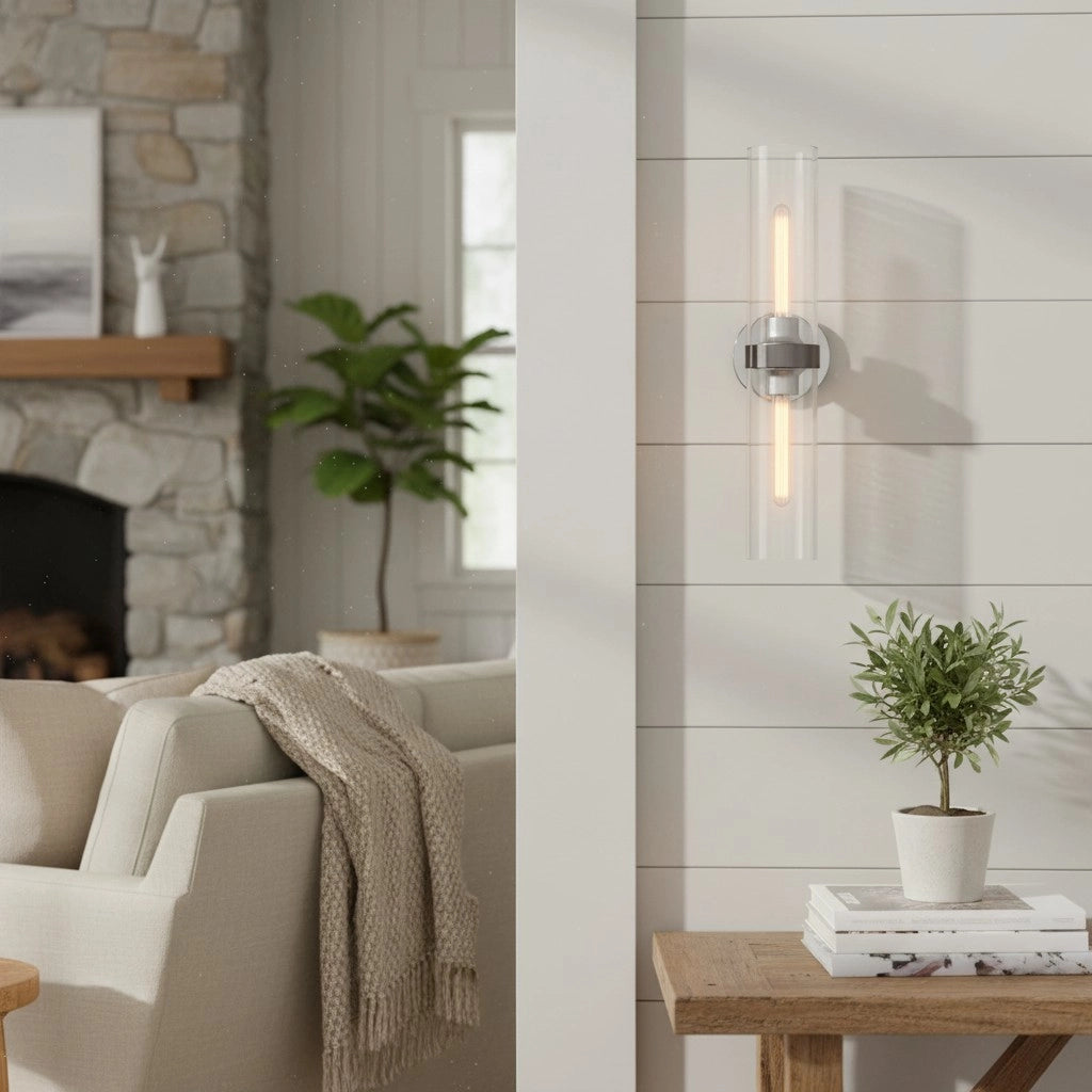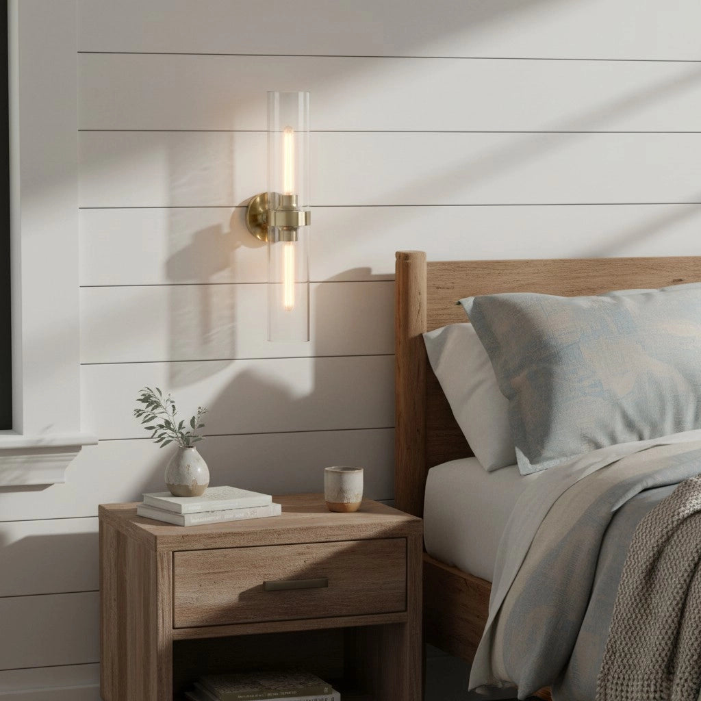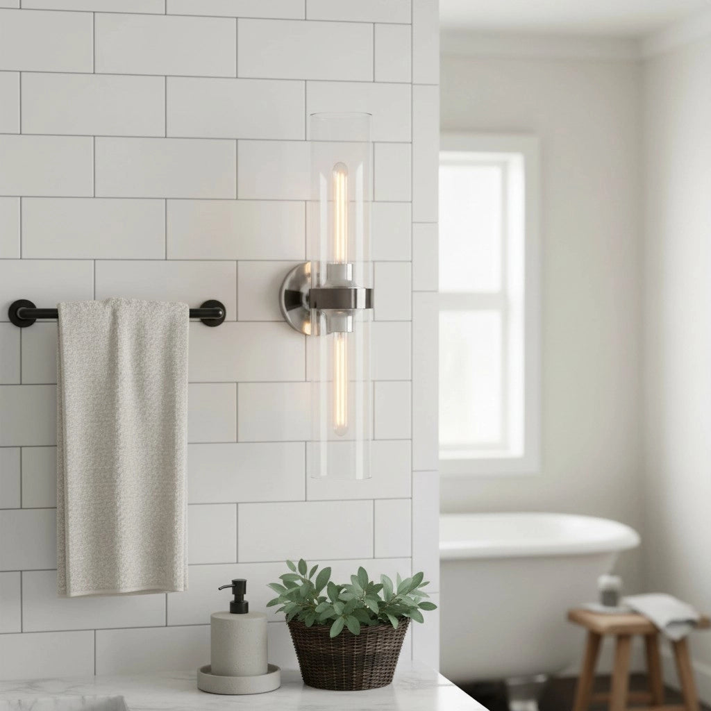 The wall sconce featuring clear glass tubes paired with refined metal in finishes. With its minimalist tube silhouette making it an ideal choice for bathrooms and bedrooms.