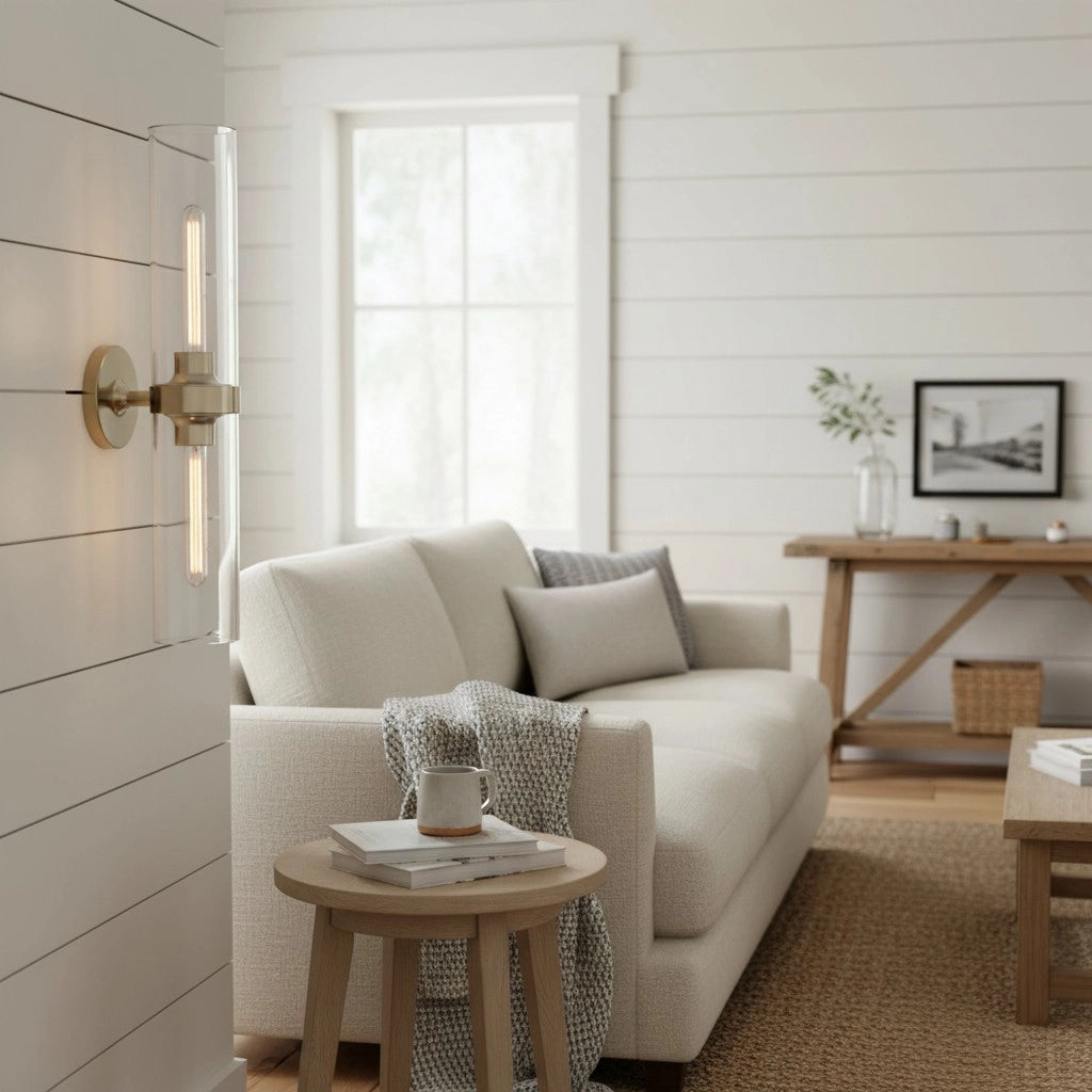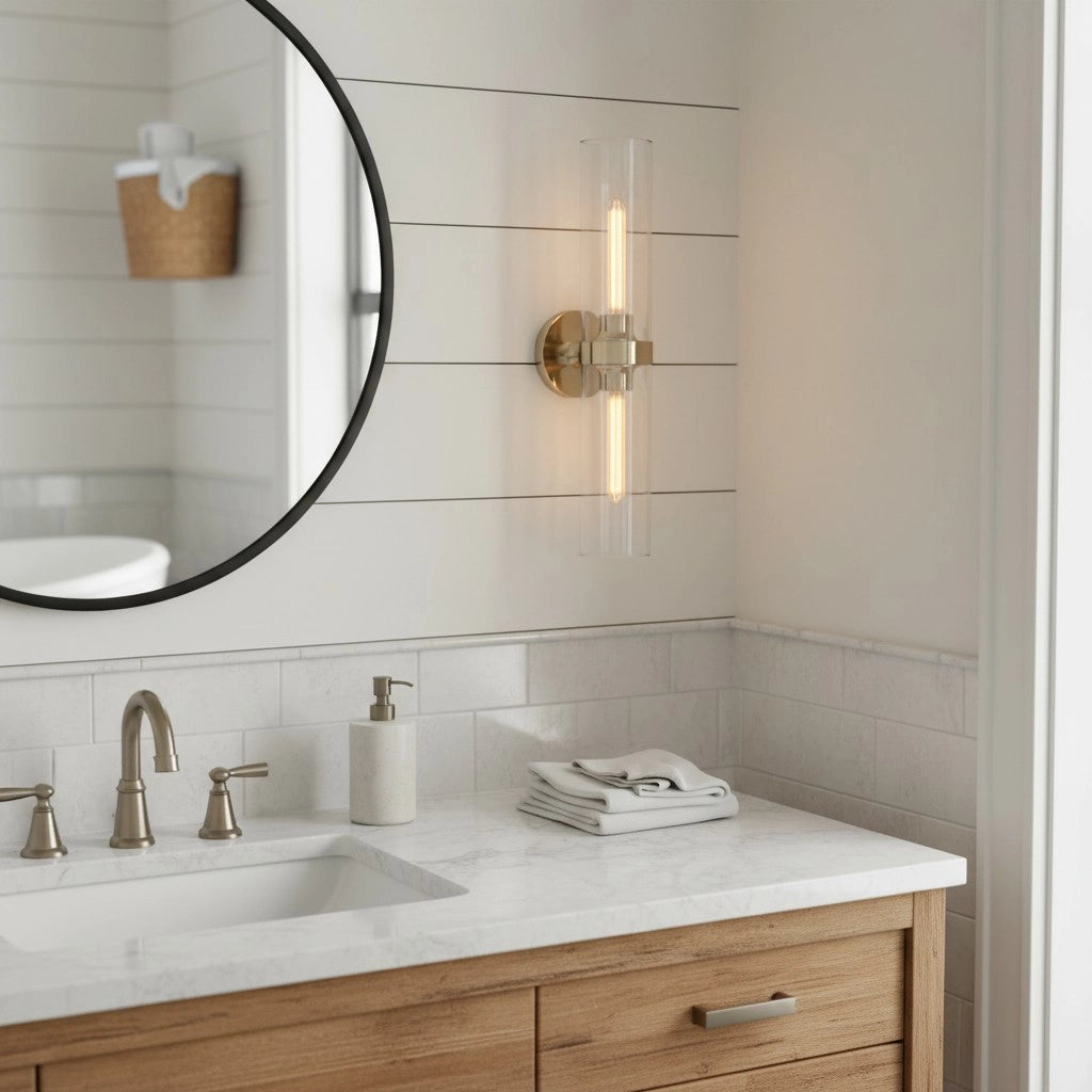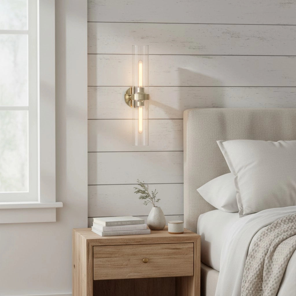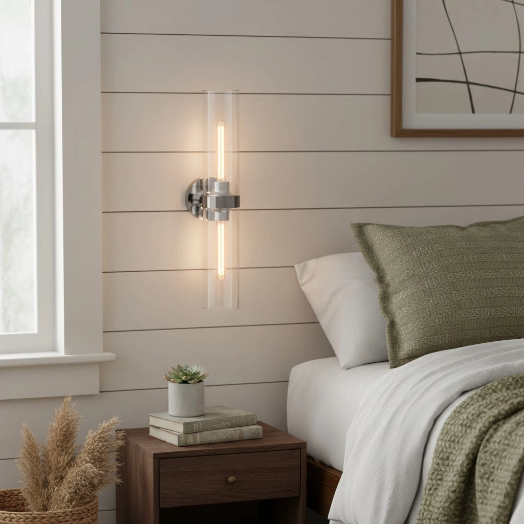 The wall sconce featuring clear glass tubes paired with refined metal in finishes. With its minimalist tube silhouette making it an ideal choice for bathrooms and bedrooms.
