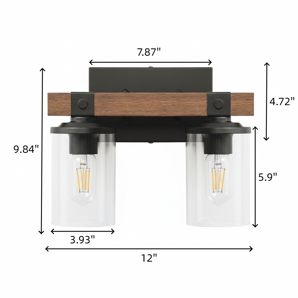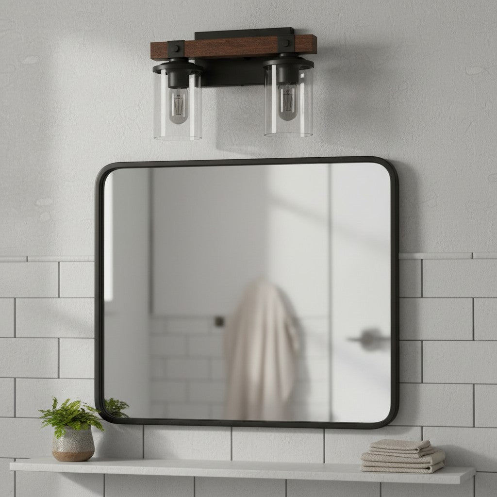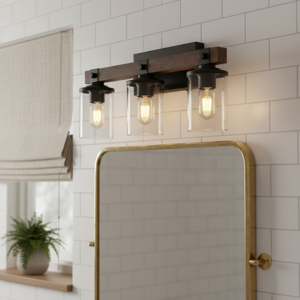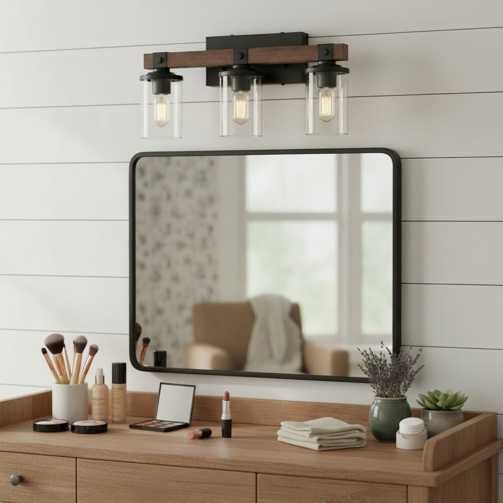 Elevate your bathroom with this Industrial Black Metal Wood Farmhouse Vanity Wall Sconce, designed with a sturdy black metal and wood frame for a clean, contemporary look. Its clear-glass shade diffuses light softly, offering both bright task illumination and warm ambient glow with dimmer compatibility.