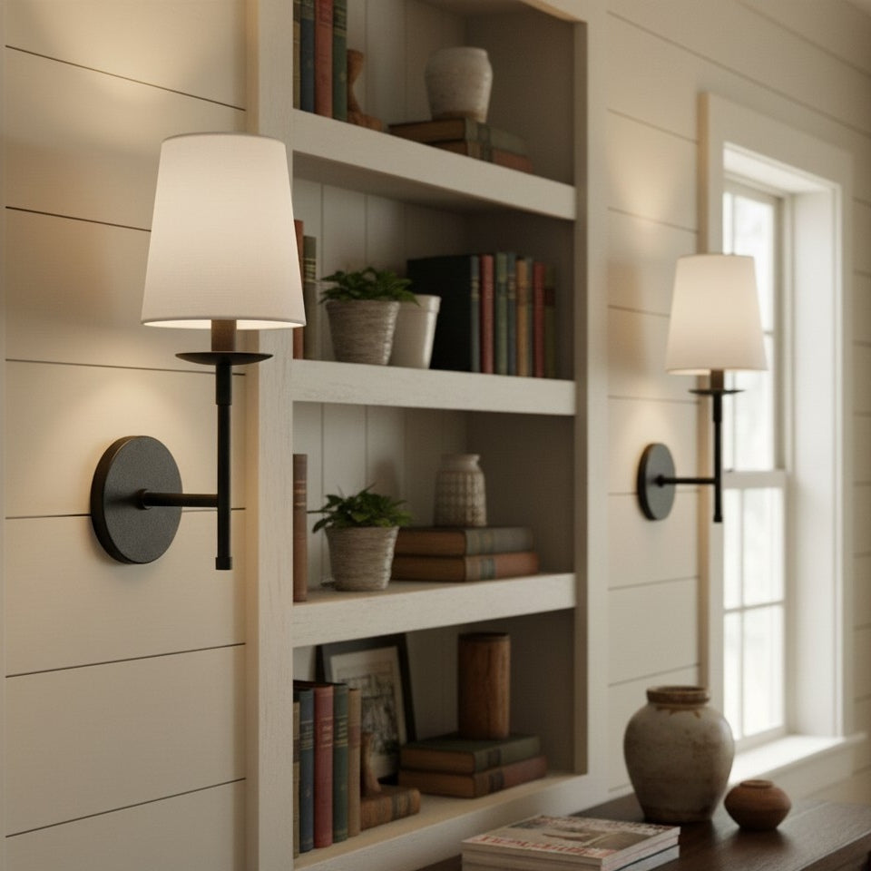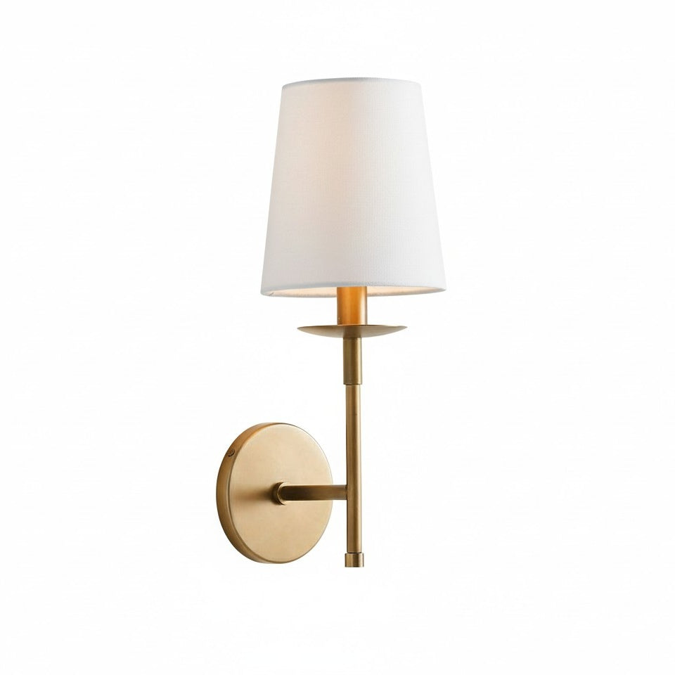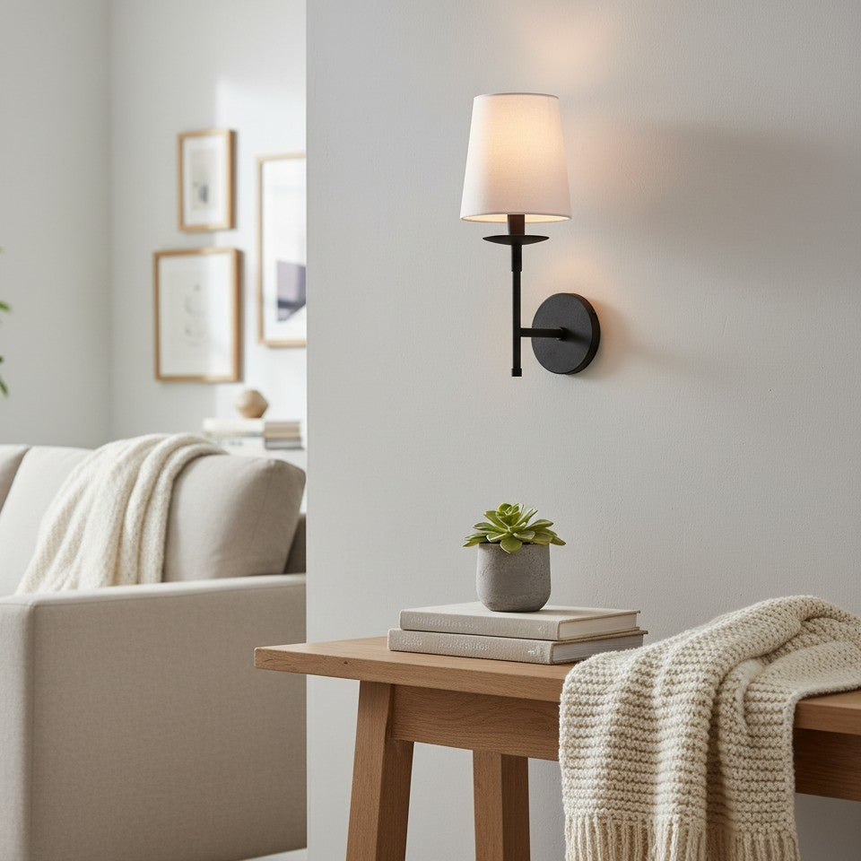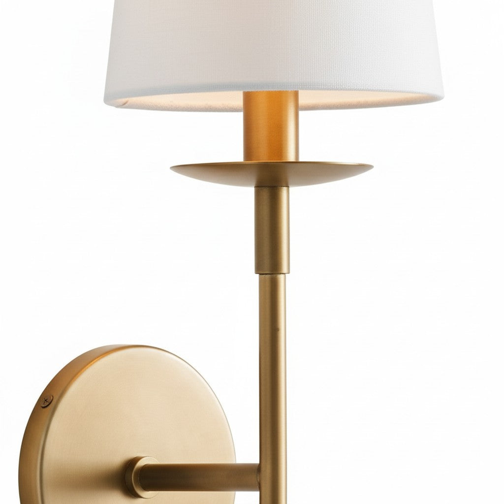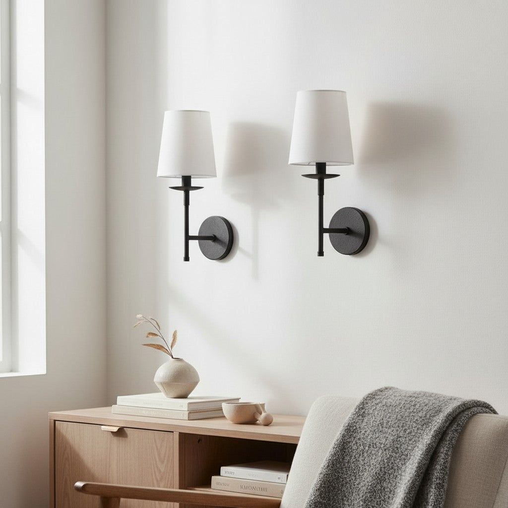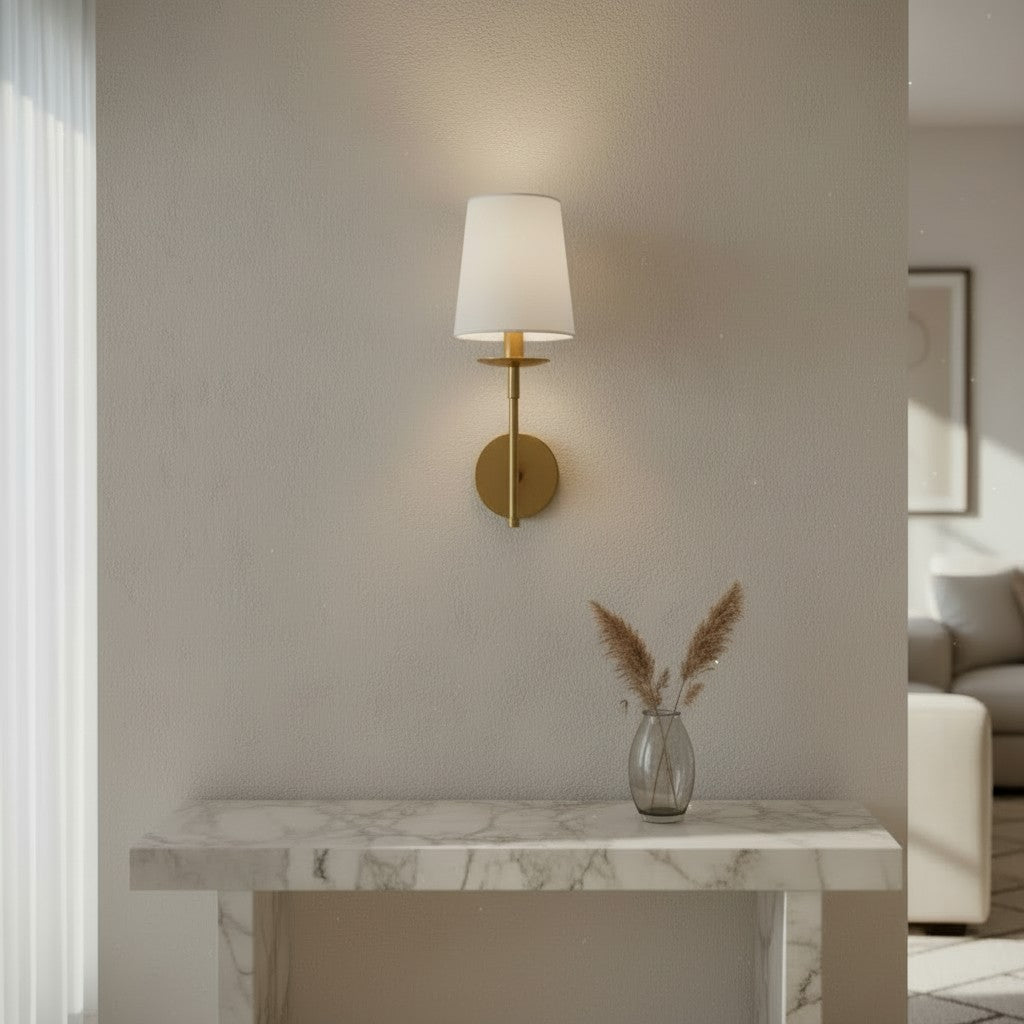 Elevate your interior with this refined Minimalist Iron White Linen Wall Sconce, crafted from durable wrought iron and finished in warm bronze or tumbled brass. Its crisp white wall sconce design features a soft-glowing linen wall sconce shade that creates a cozy, inviting ambiance.