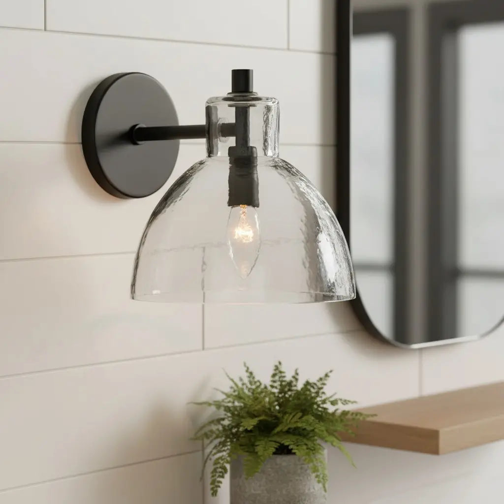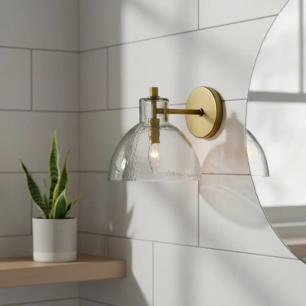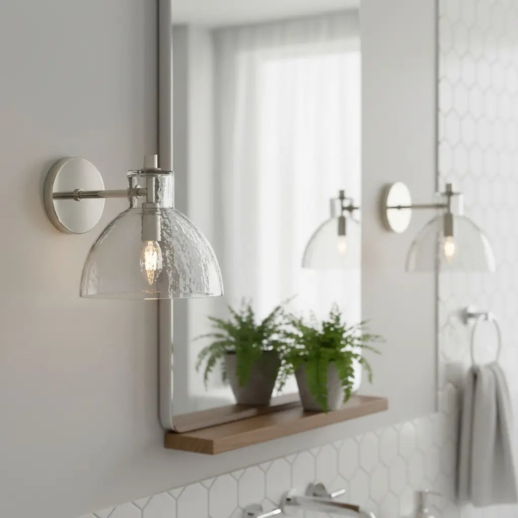 This modern, minimalist wall lamp pairs sleek metal accents with textured glass bowl shades, merging clean lines and subtle, organic charm. Balancing understated elegance and contemporary simplicity, it elevates interior spaces. Ideal for bedside walls, bathroom vanities, or living room accent areas.