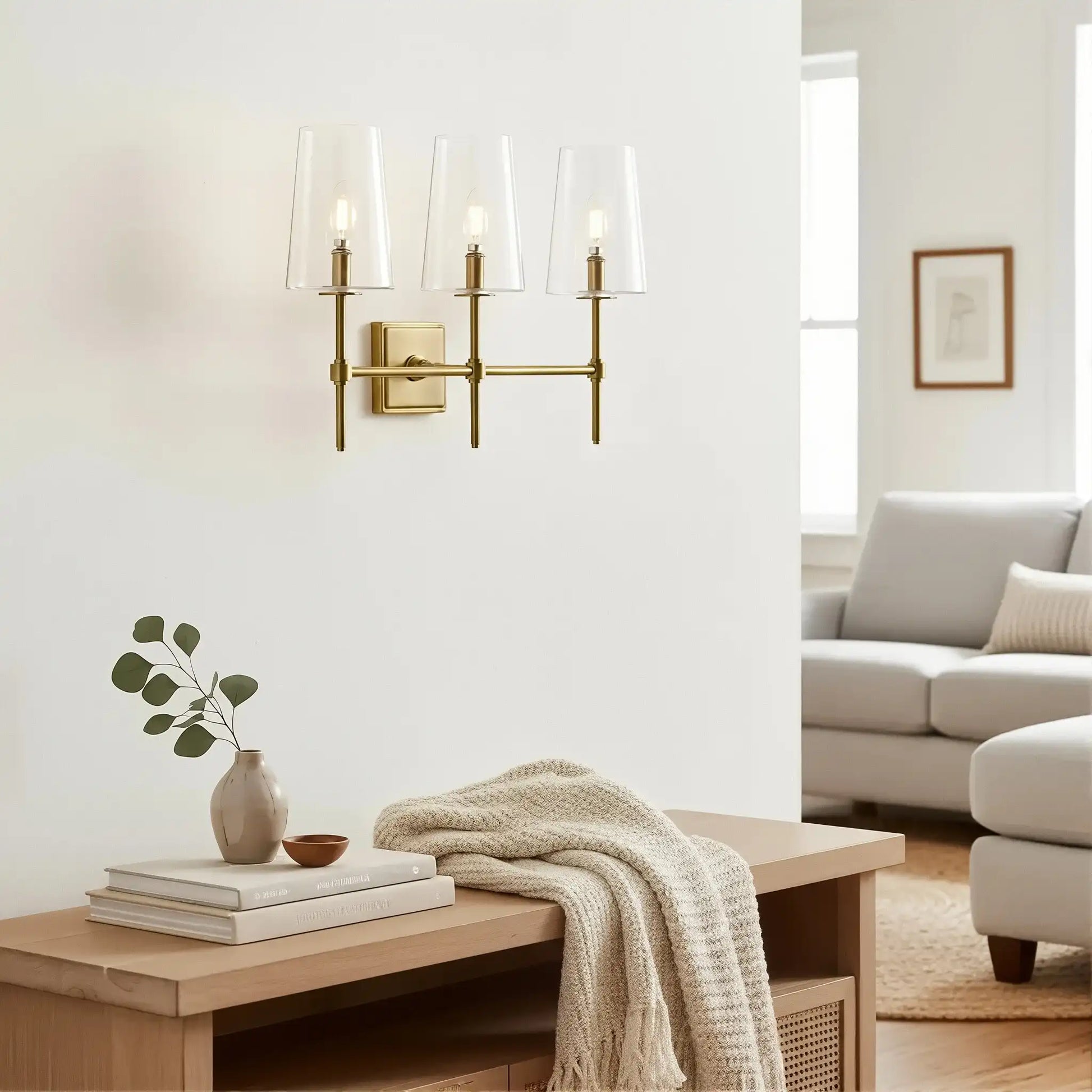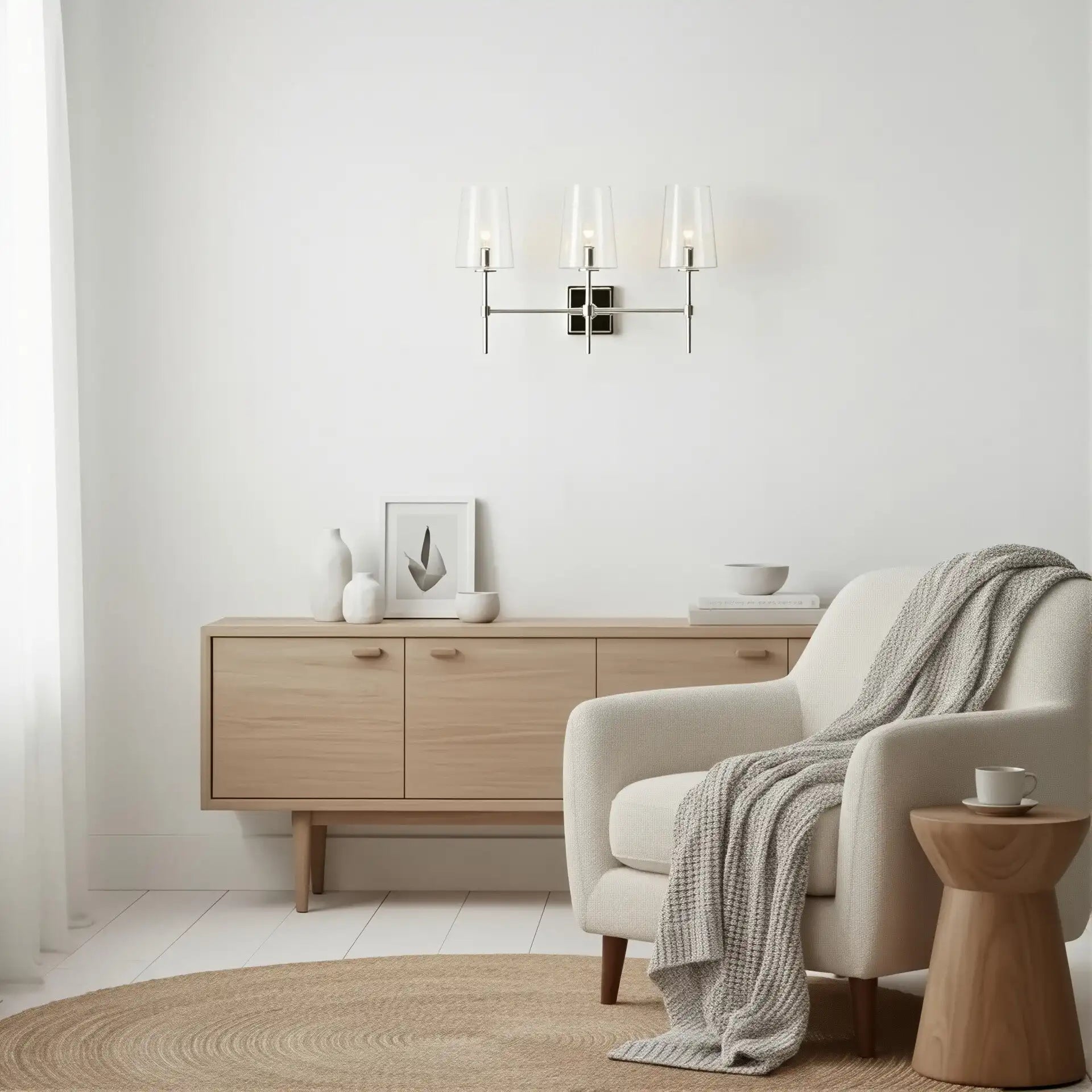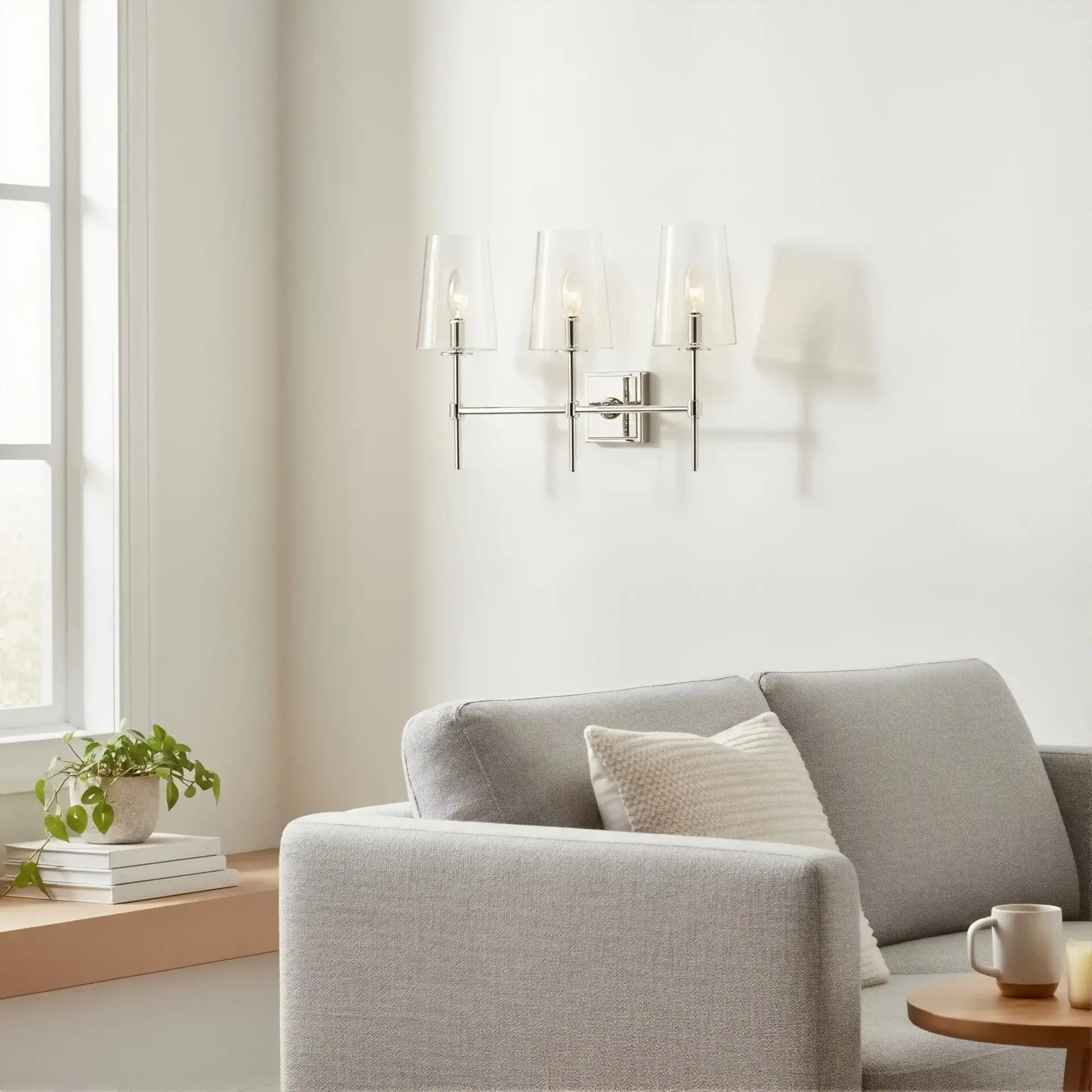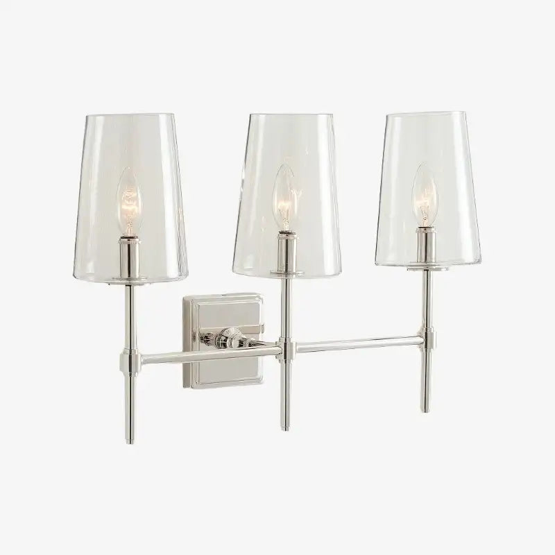 The Triple Wall Sconce combines three rounded glass shades with a sculptural arm assembly for elegant, balanced style. Its refined transitional design suits baths, vanities, hallways, and entries, offering adjustable mounting and versatile proportions for modern or classic interiors.