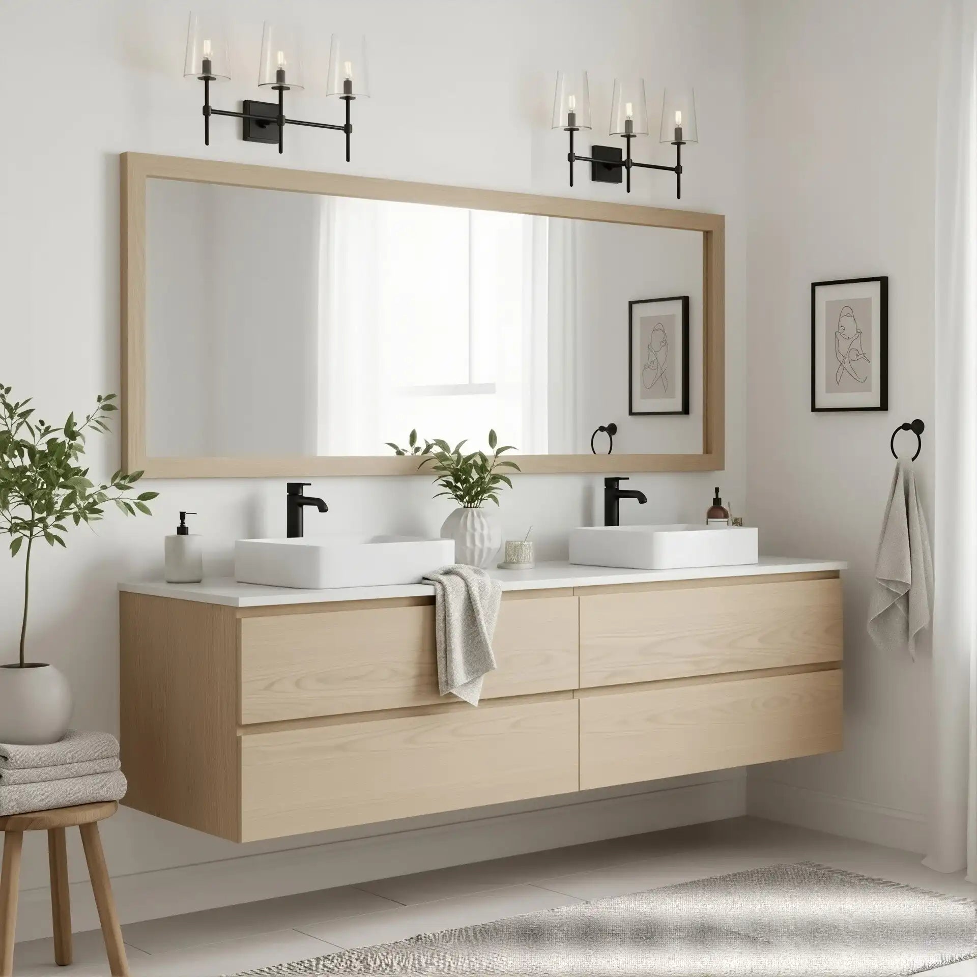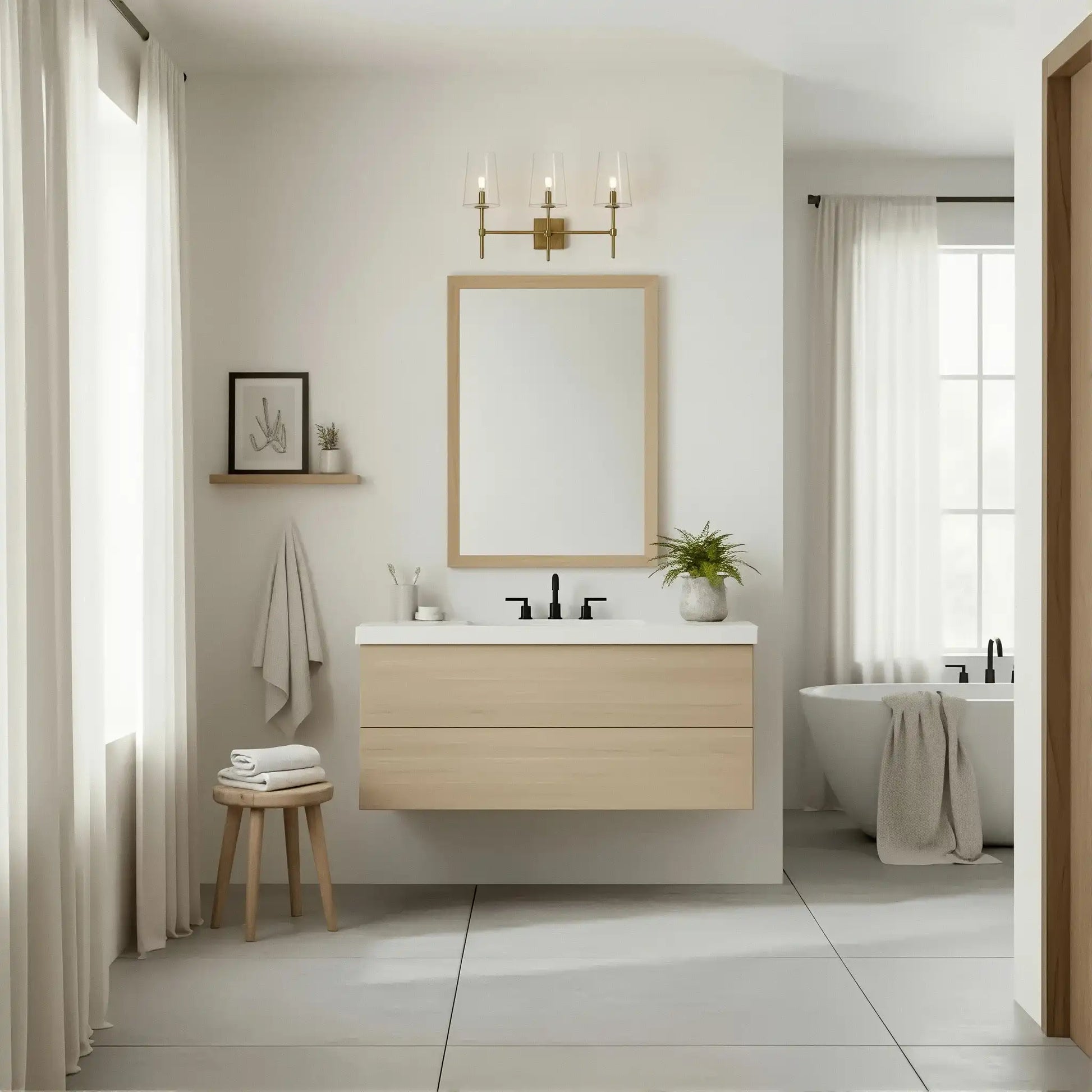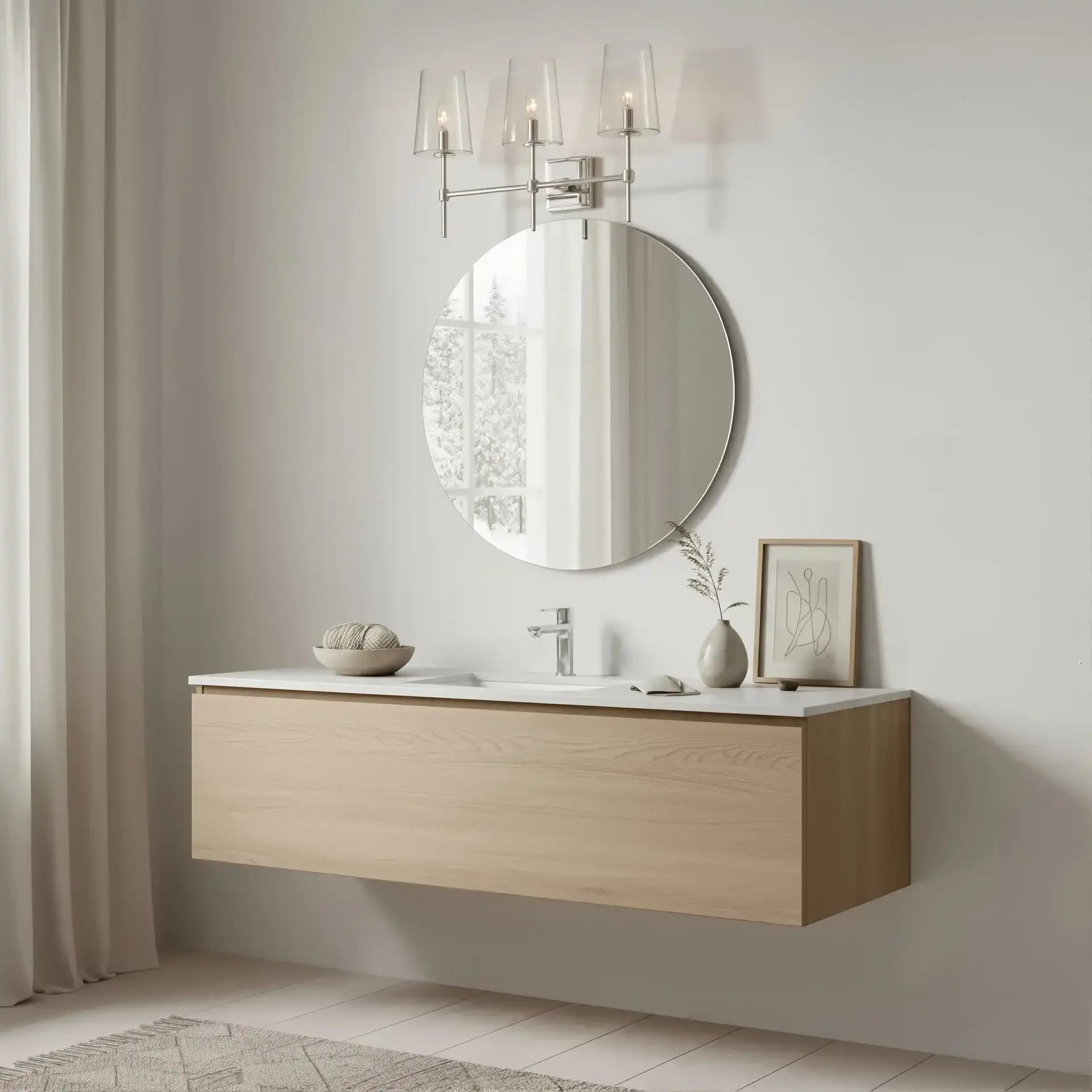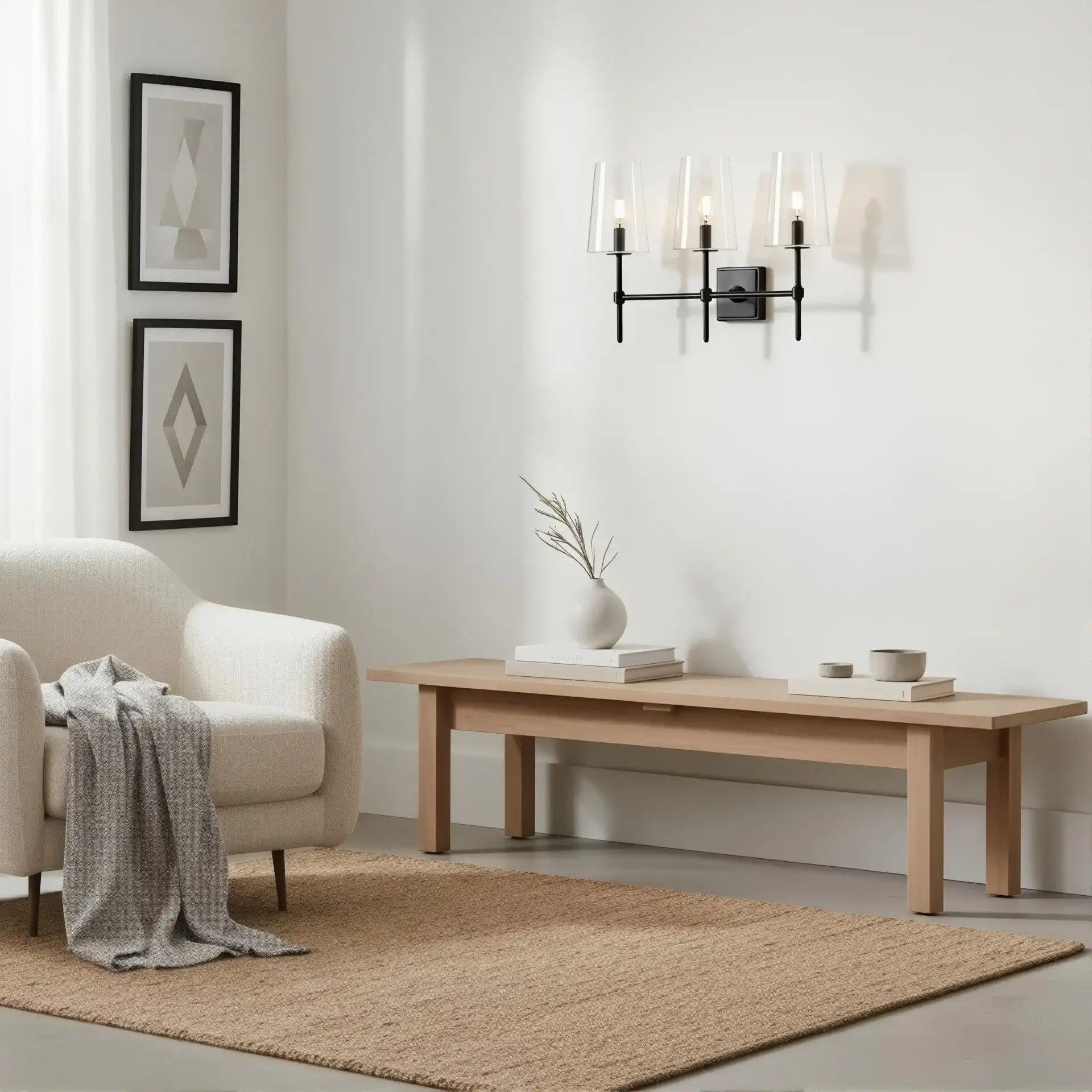The Triple Wall Sconce combines three rounded glass shades with a sculptural arm assembly for elegant, balanced style. Its refined transitional design suits baths, vanities, hallways, and entries, offering adjustable mounting and versatile proportions for modern or classic interiors.