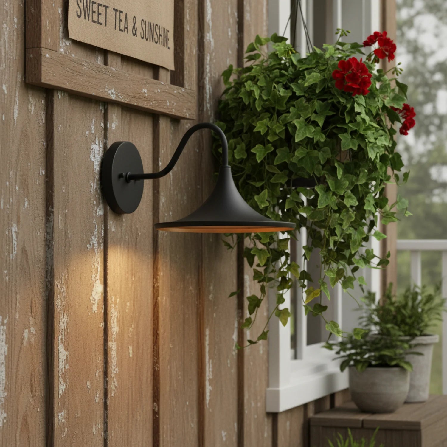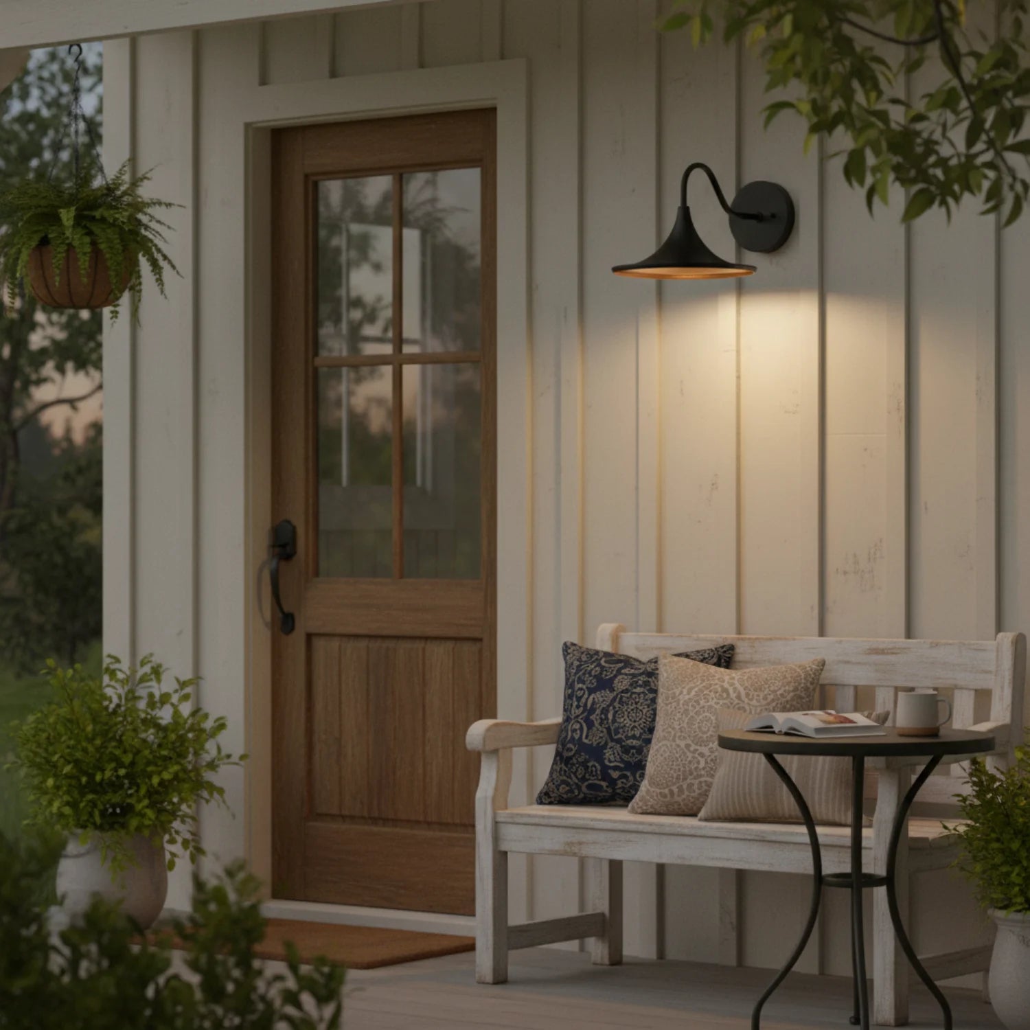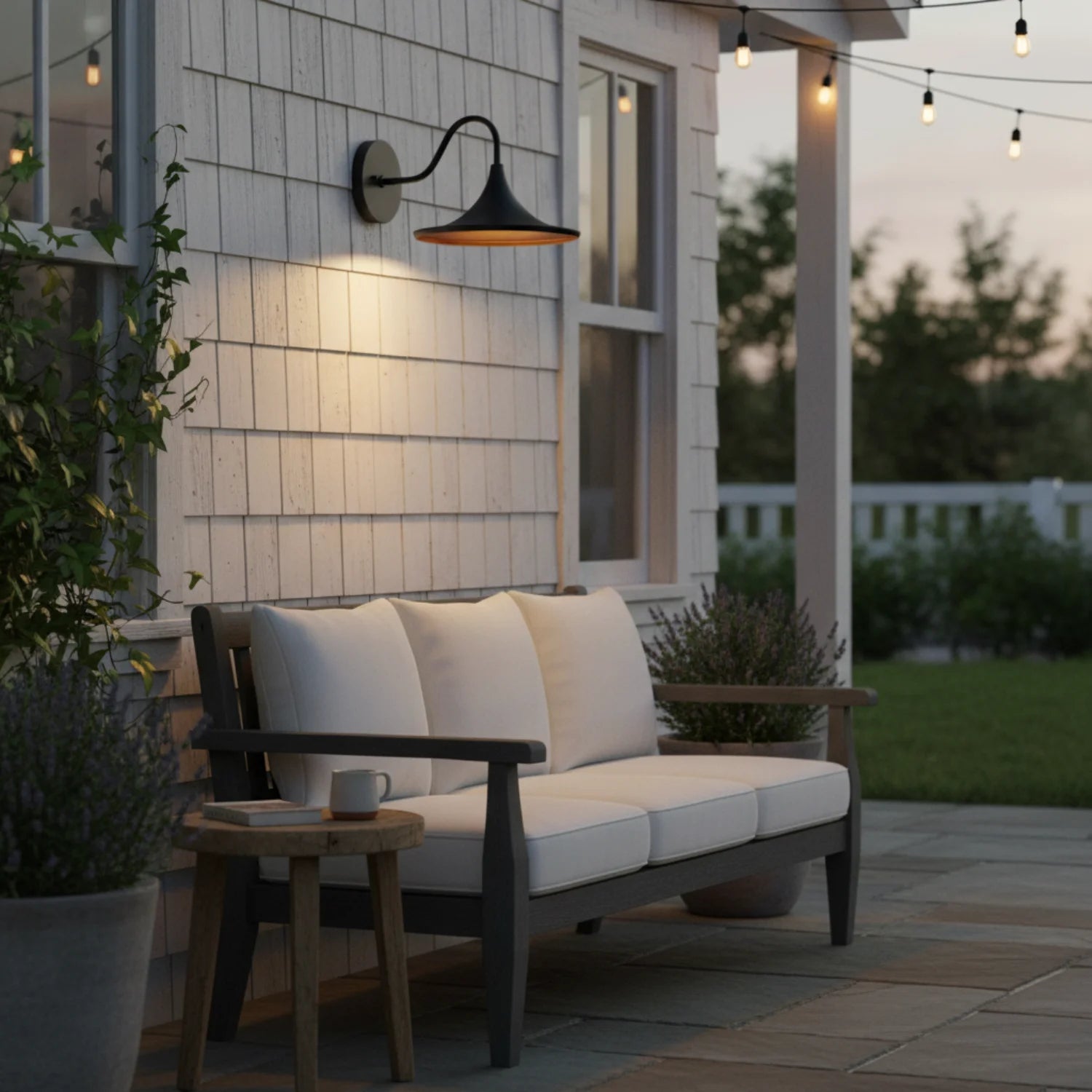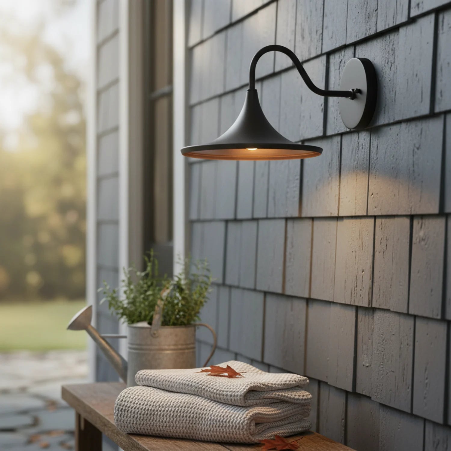 This outdoor waterproof LED wall sconce cleverly blends modern design with practical outdoor lighting functionality, creating a warm and inviting glow for your outdoor spaces. Its domed metal shade paired with a contrasting metallic lining adds depth and aesthetic appeal, making it ideal for porches, patios, and entrances.