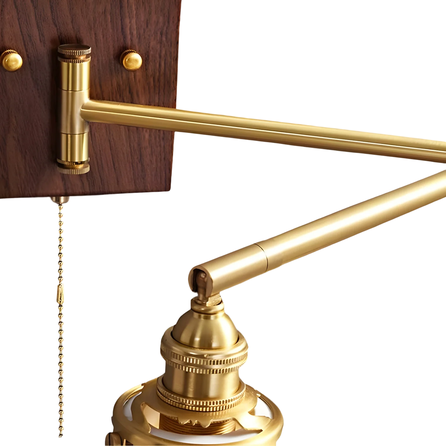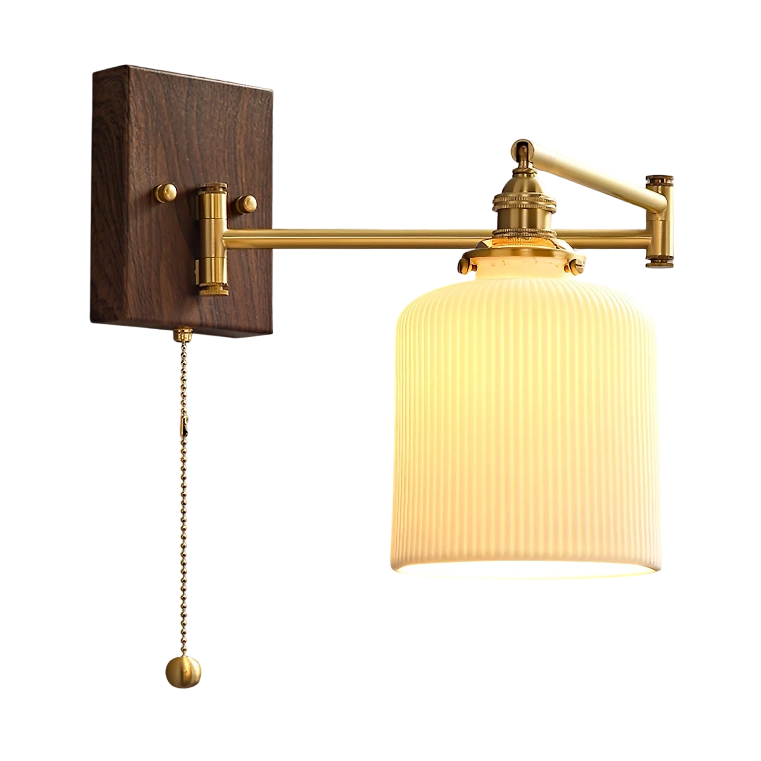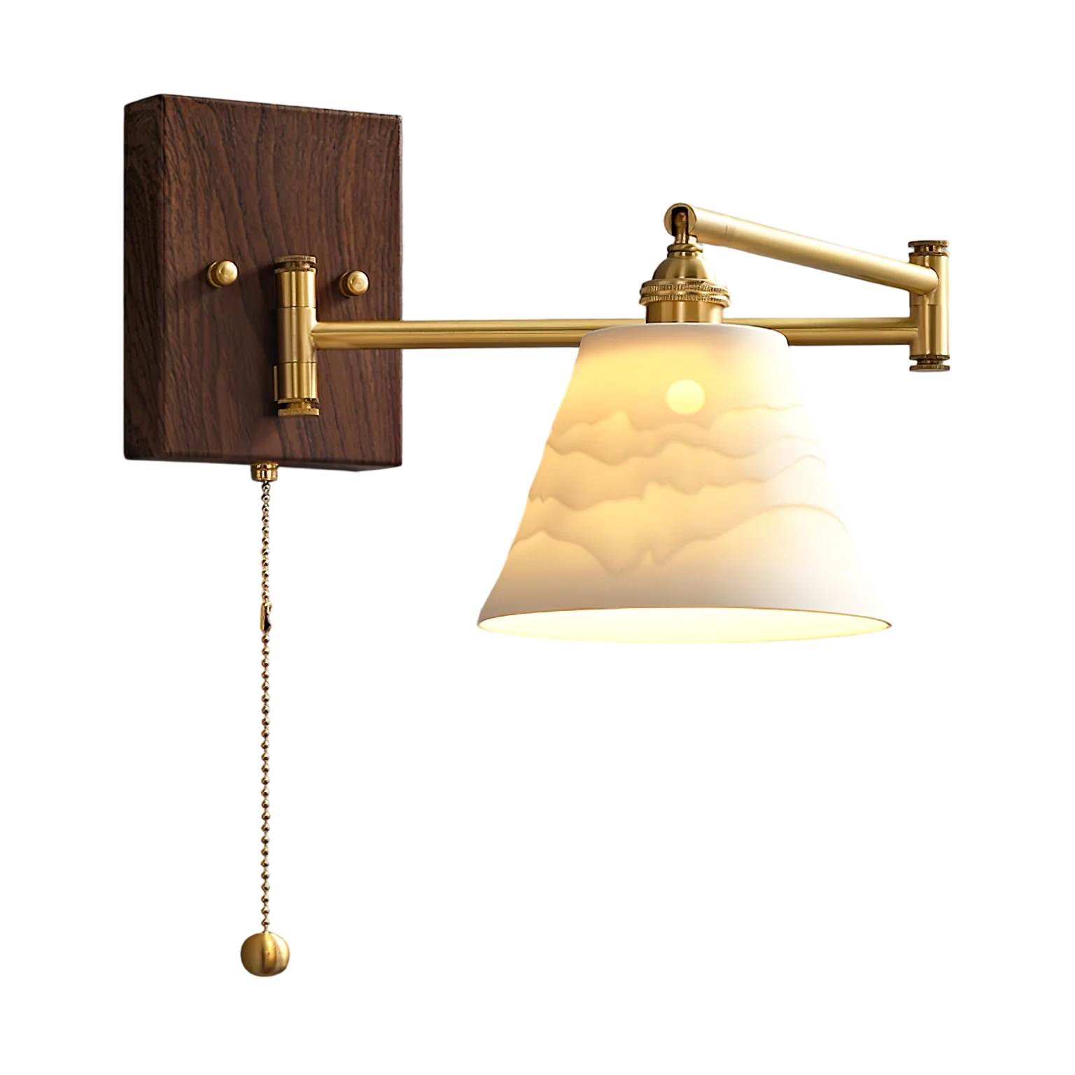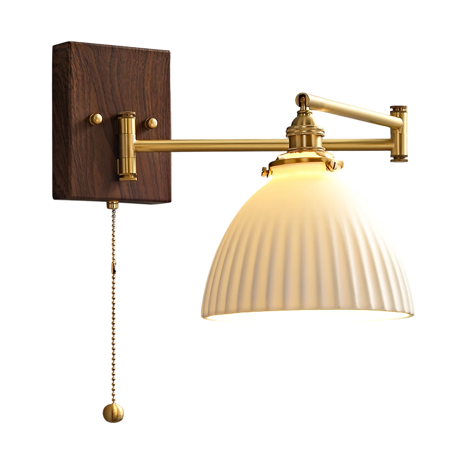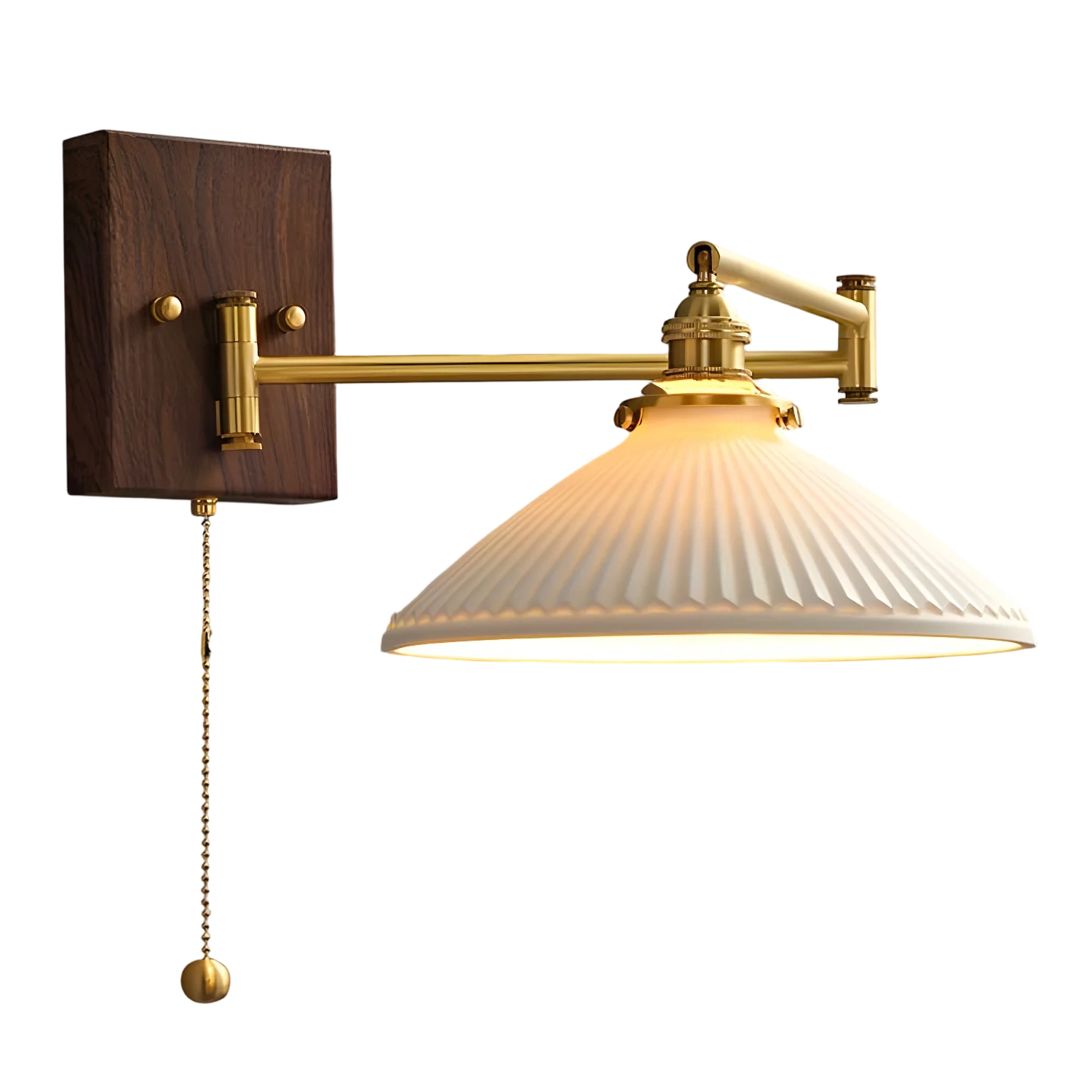 A refined ceramic-hood wall sconce with a brass-finish adjustable swing arm and warm wood backplate. The ceramic diffuser casts soft, directional light ideal for bedside reading, hallways, hotel rooms, cafés, or living areas. Pull-chain switching and a swivel arm deliver practical, vintage-inspired flexibility. Multi-attribute friendly - available in different finishes and sizes.