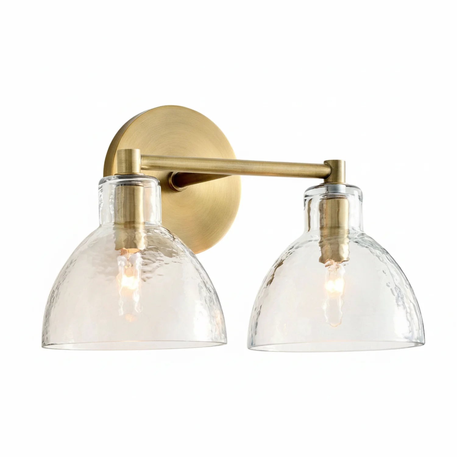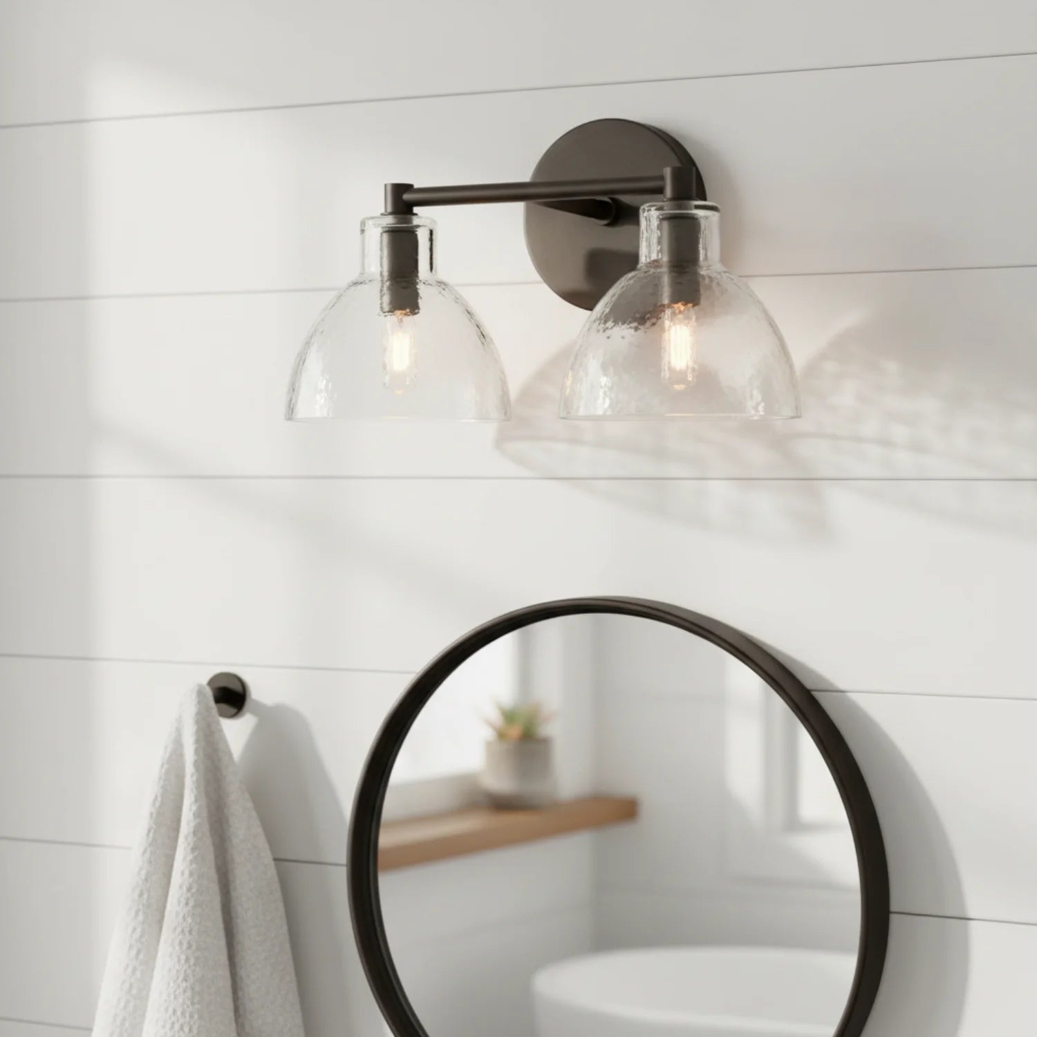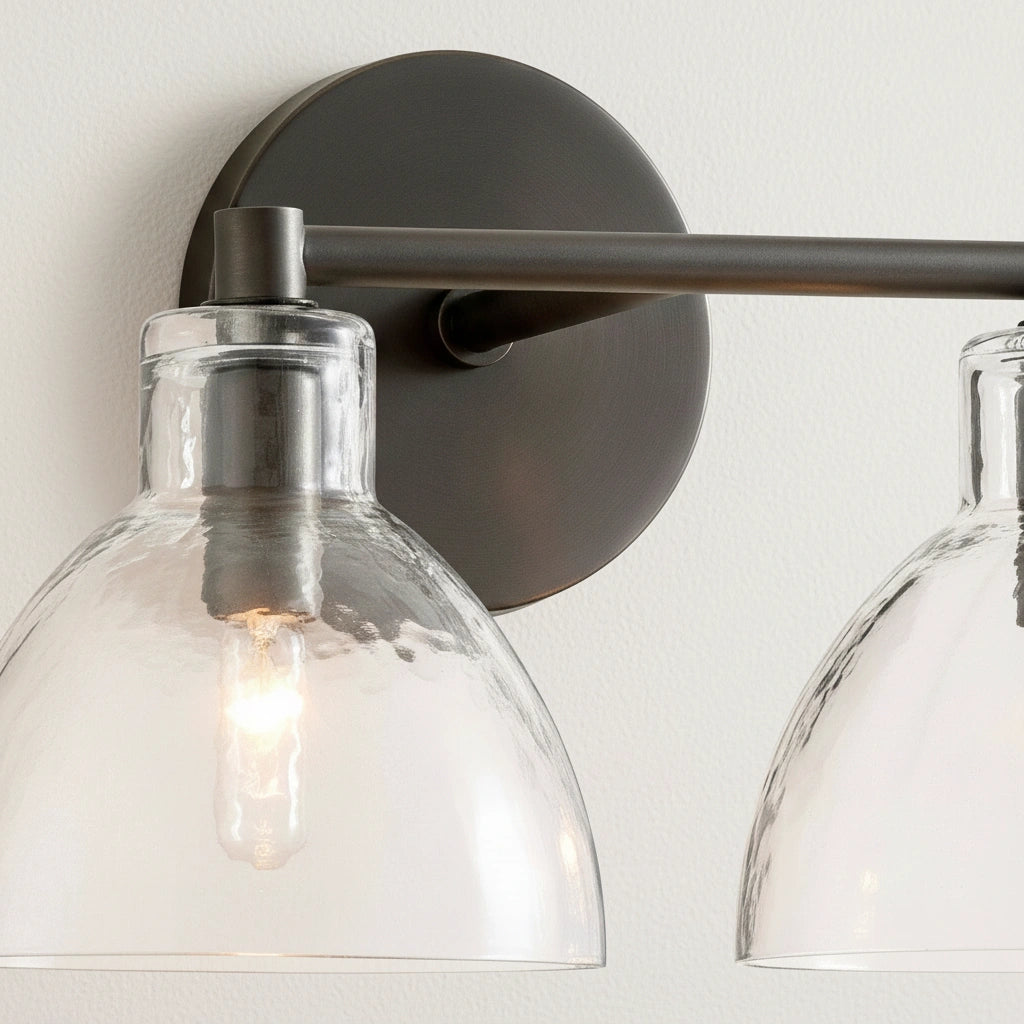 This double-headed wall lamp, with its textured glass and multi-colored metal, is perfect for the bathroom and enhances the overall feel of the space.