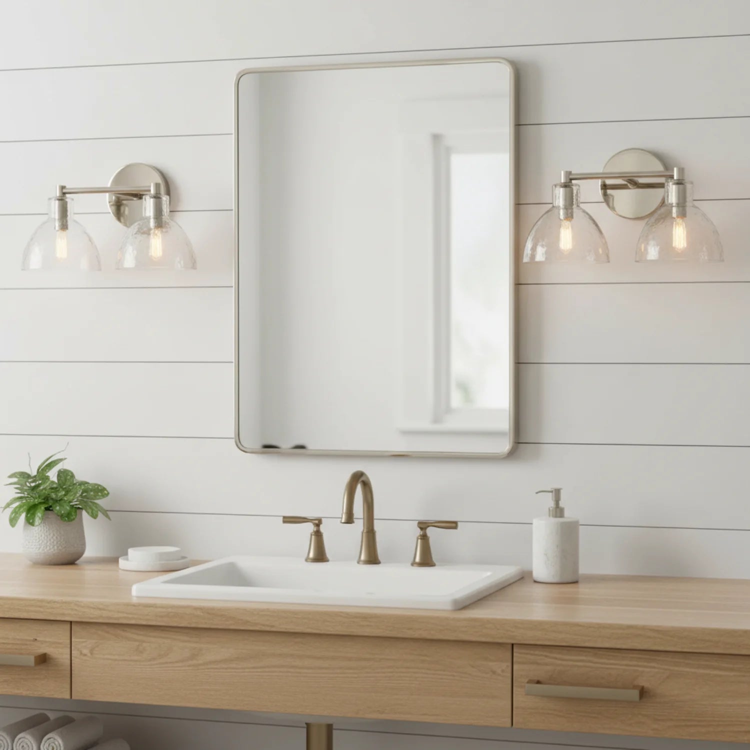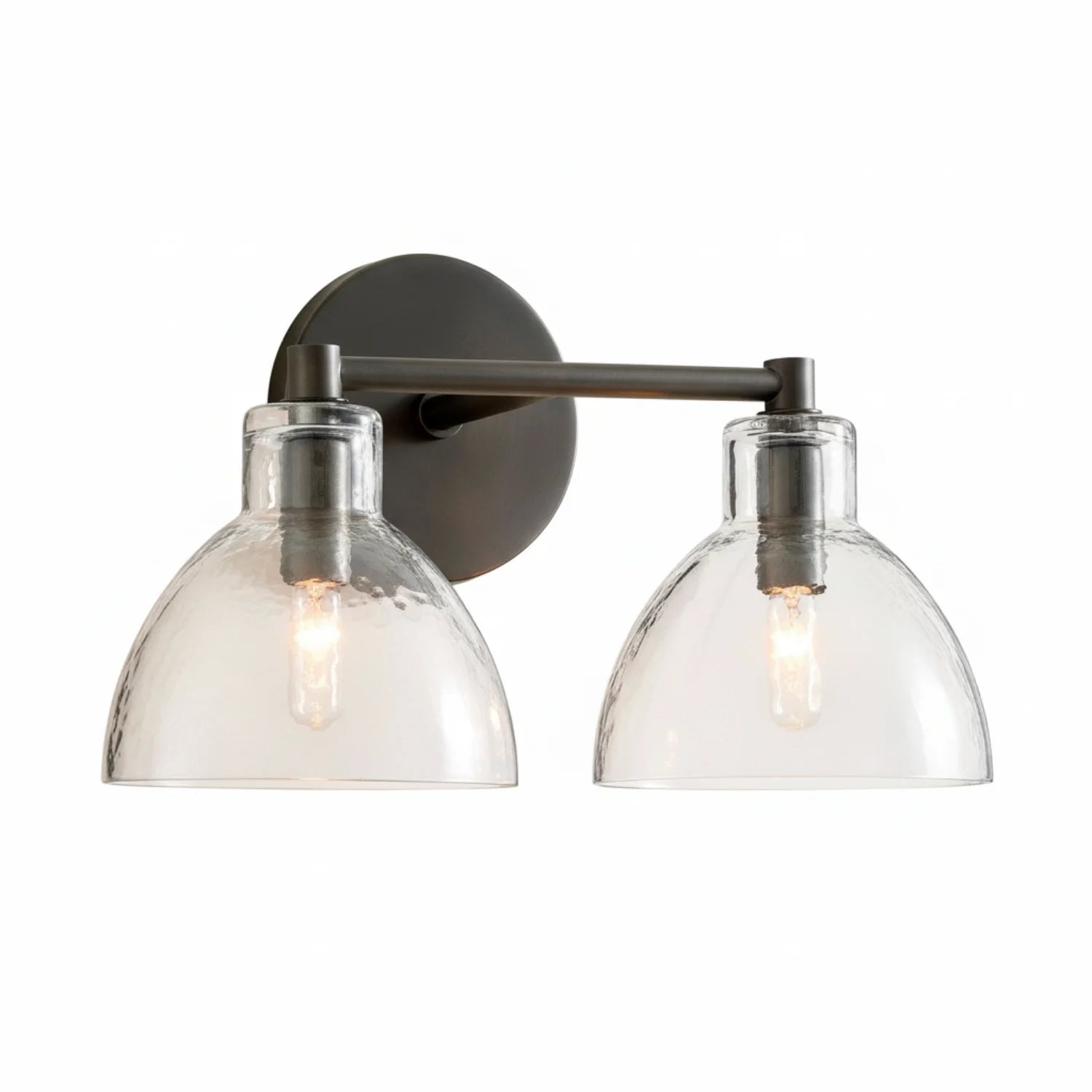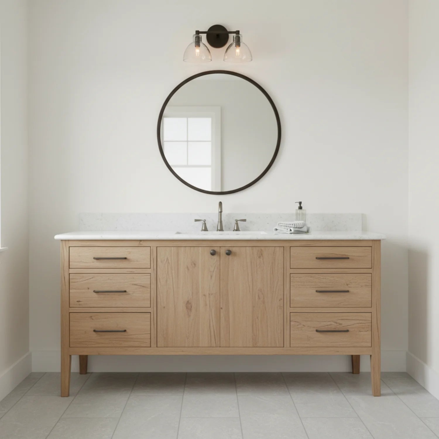 This double-headed wall lamp, with its textured glass and multi-colored metal, is perfect for the bathroom and enhances the overall feel of the space.
