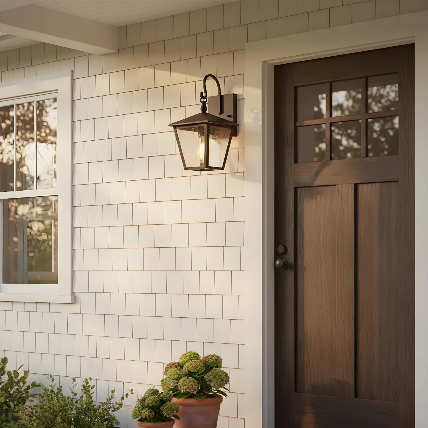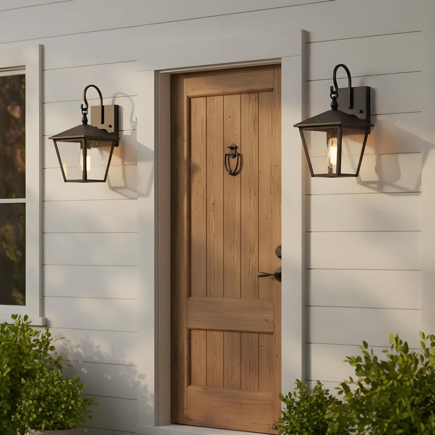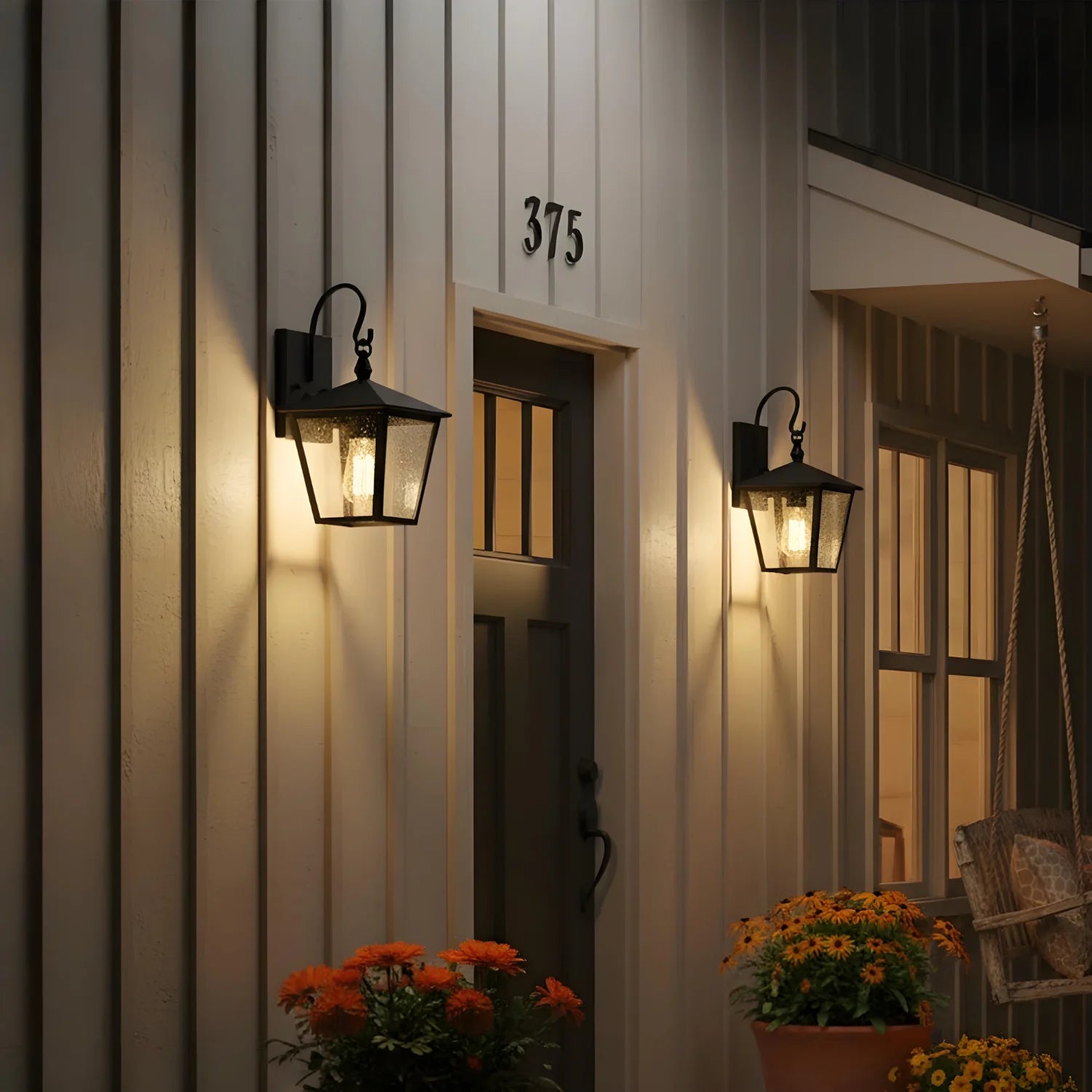 This wall lamp, inspired by lanterns and featuring seedy glass, is perfect for installation on entrances and patios.