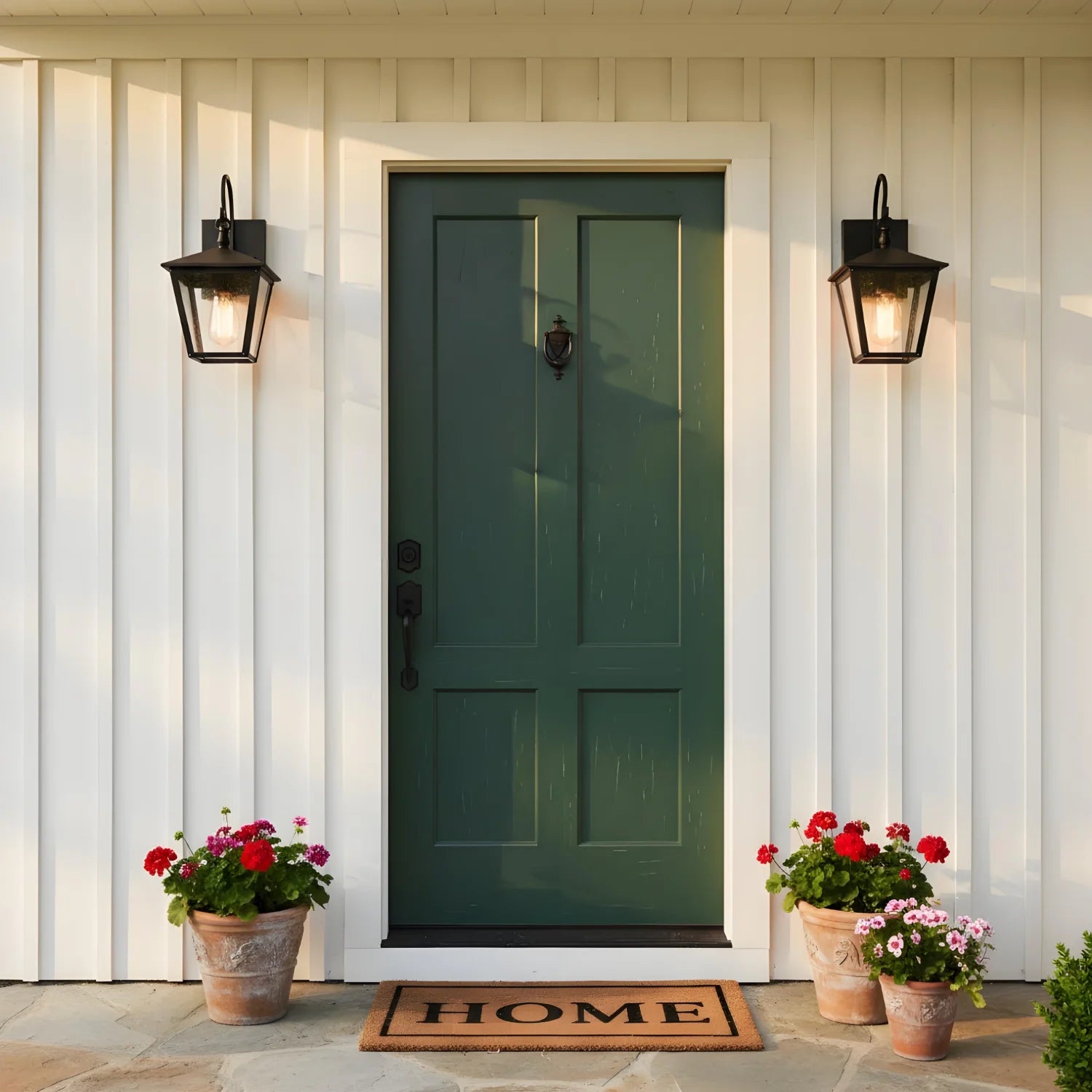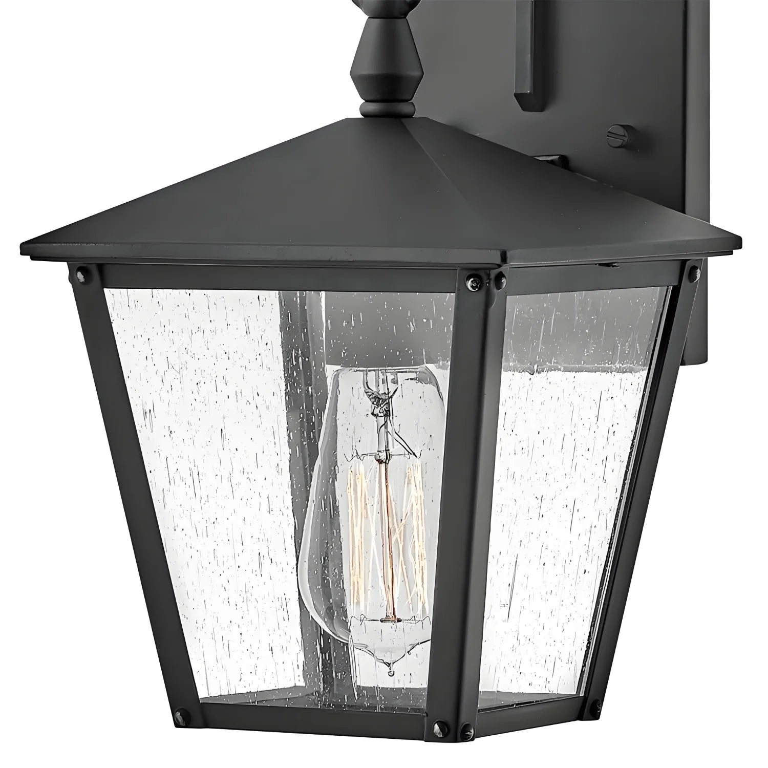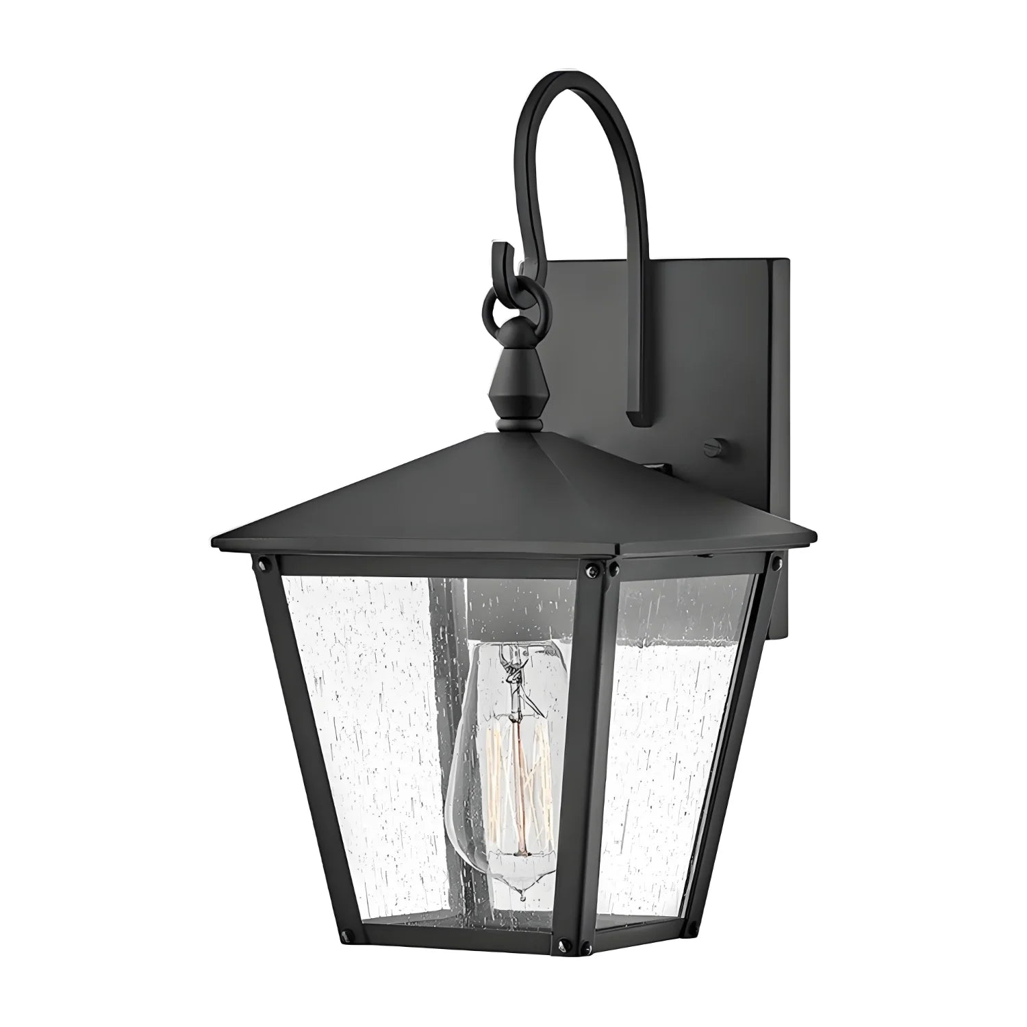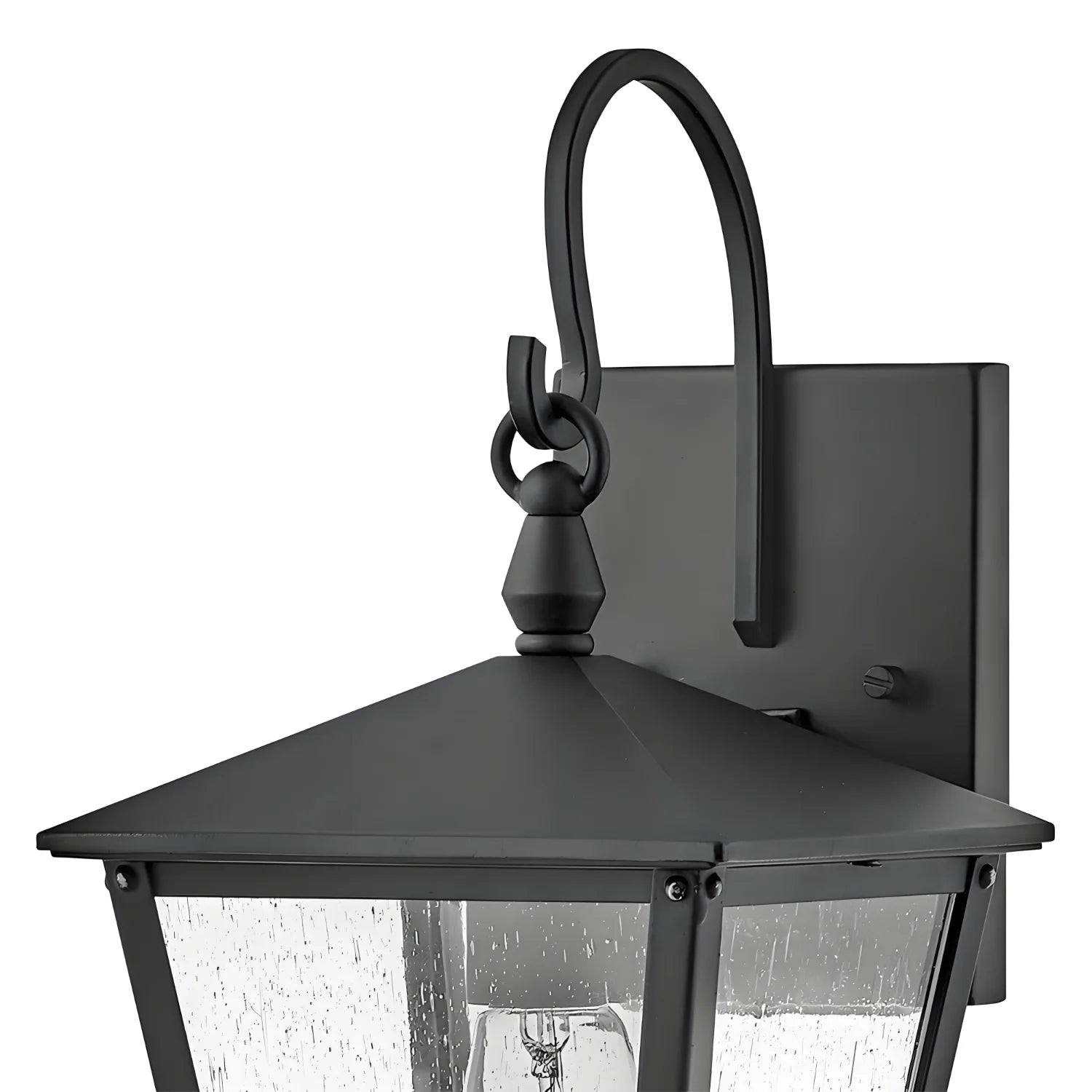 This wall lamp, inspired by lanterns and featuring seedy glass, is perfect for installation on entrances and patios.