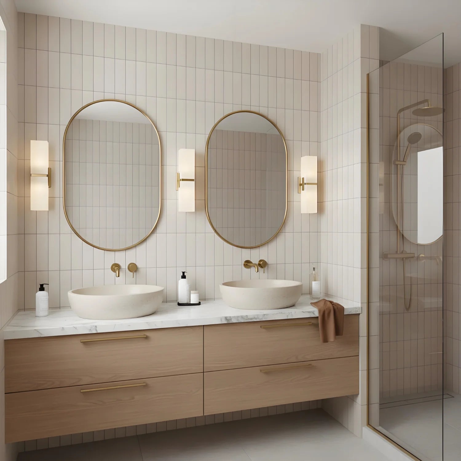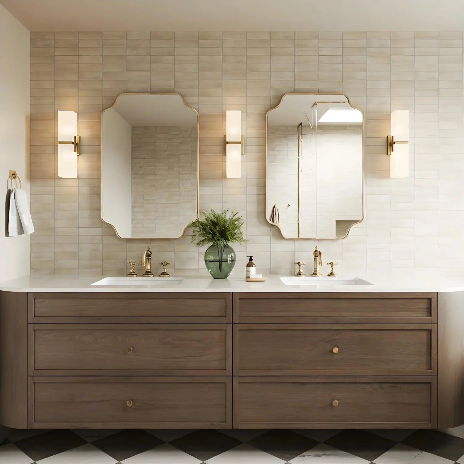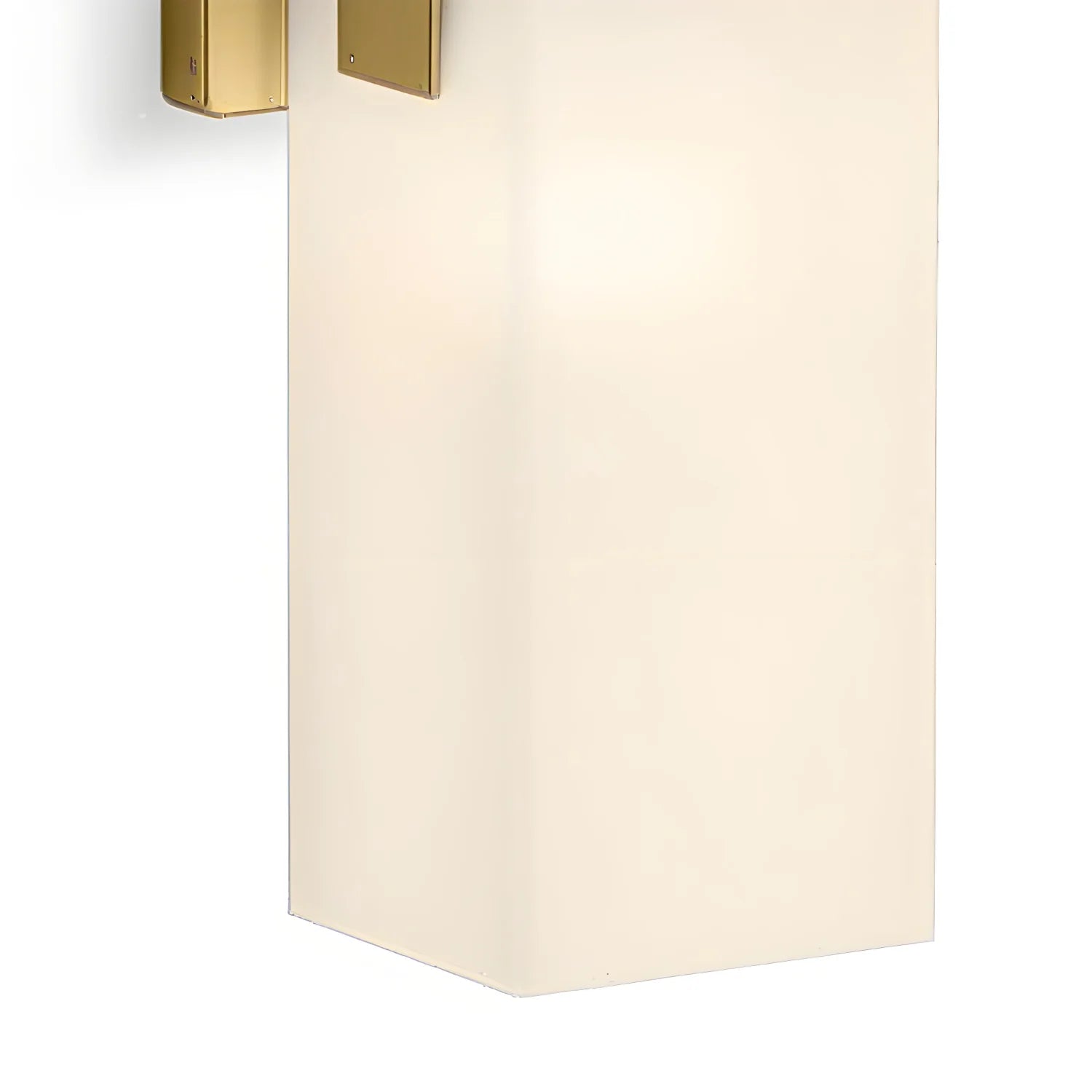 This wall lamp boasts frosted glass shade and brass details, a sleek choice to add elegance to bathrooms or chic spaces.